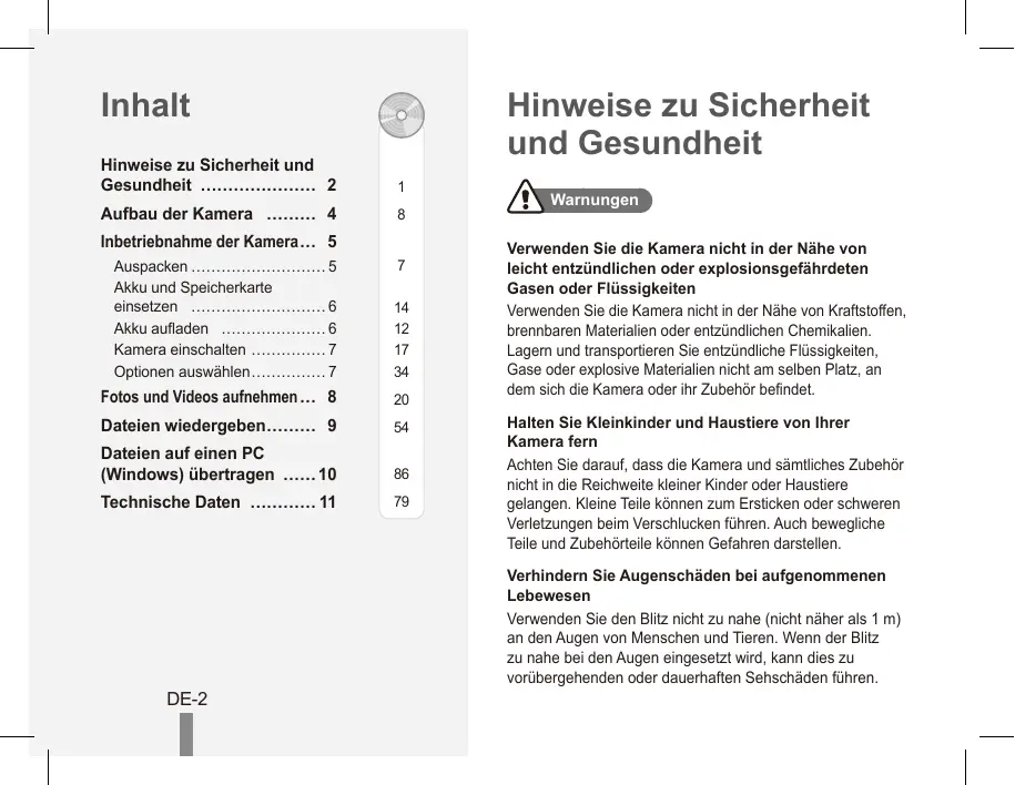 DE-2 Warnungen Verwenden Sie die Kamera nicht in der Nähe von leicht entzündlichen oder explosionsgefährdeten Gasen oder Flüssigkeiten Verwenden Sie die Kamera nicht in der Nähe von Kraftstoffen, brennbaren Materialien oder entzündlichen Chemikalien. Lagern und transportieren Sie entzündliche Flüssigkeiten, Gase oder explosive Materialien nicht am selben Platz, an dem sich die Kamera oder ihr Zubehör befindet. Halten Sie Kleinkinder und Haustiere von Ihrer Kamera fern Achten Sie darauf, dass die Kamera und sämtliches Zubehör nicht in die Reichweite kleiner Kinder oder Haustiere gelangen. Kleine Teile können zum Ersticken oder schweren Verletzungen beim Verschlucken führen. Auch bewegliche Teile und Zubehörteile können Gefahren darstellen. Verhindern Sie Augenschäden bei aufgenommenen Lebewesen Verwenden Sie den Blitz nicht zu nahe (nicht näher als 1 m) an den Augen von Menschen und Tieren. Wenn der Blitz zu nahe bei den Augen eingesetzt wird, kann dies zu vorübergehenden oder dauerhaften Sehschäden führen. Achtung Behandeln und lagern Sie die Kamera sorgfältig und vernünftig