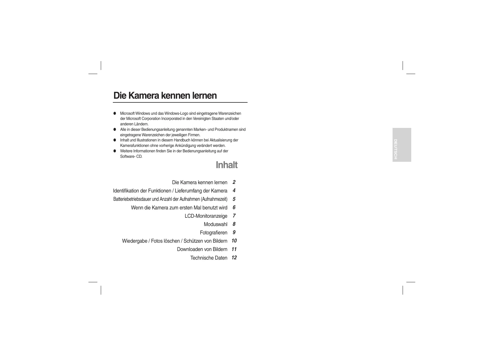 Die Kamera kennen lernen © Microsoft Windows und das Windows-Logo sind eingetragene Warenzeichen der Microsoft Corporation Incorporated in den Vereinigten Staaten und/oder anderen Ländem © All in dieser Bedienungsanleïtung genannten Marken- und Produkinamen sind eingetragene Warenzeichen der jeweiligen Firmen. © inhaltund Ilustrationen in diesem Handbuch kônnen bei Aktualsierung der Kamerafunktionen ohne vorherige Ankiündigung verändert werden. ‘© Weïtere Informationen finden Si in der Bedienungsanleitung auf der Software- CD. Inhalt Die Kamera kennen lernen 2 Identifikation der Funktionen / Lieferumfang der Kamera 4 Batteriebetriebsdauer und Anzahl der Aufnahmen (Aufnahmezeit) 5 Wenn die Kamera zum ersten Mal benutzt wird 6 LCD-Monitoranzeige 7 Moduswahl 8 Fotografieren 9 Wiedergabe / Fotos lôschen / Schützen von Bildern 10 Downloaden von Bildern 11 Technische Daten 12