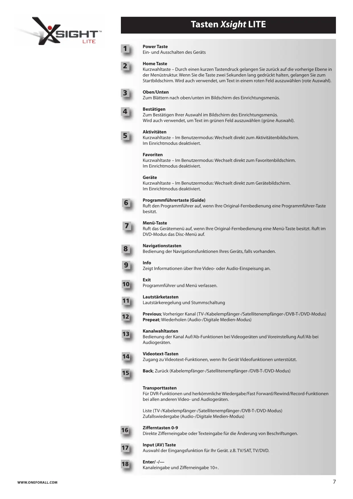 Die Xsight kennenlernen Die XsightPlUS/Xsight lITe ist die neueste Universal-Fernbedienung von ONE FOR ALL mit einem Funktionsangebot, das keine Wünsche offen lässt. Sie ermöglicht die uneingeschränkte Bedienung aller Ihrer infrarot-gesteuerten Audio/Video-Geräte und bietet High-End-Leistungsmerkmale wie z. B. Lernfunktion und Aktivitätssteuerung. Sie können die Fernbedienung zur Steuerung Ihrer Geräte mithilfe der einfachen Bildschirmanweisungen auf der Fernbedienung einrichten oder aber eine Verbindung mit einem PC herstellen, um erweiterte Funktionen wie z. B. Aktivitäten und Favoriten hinzuzufügen.