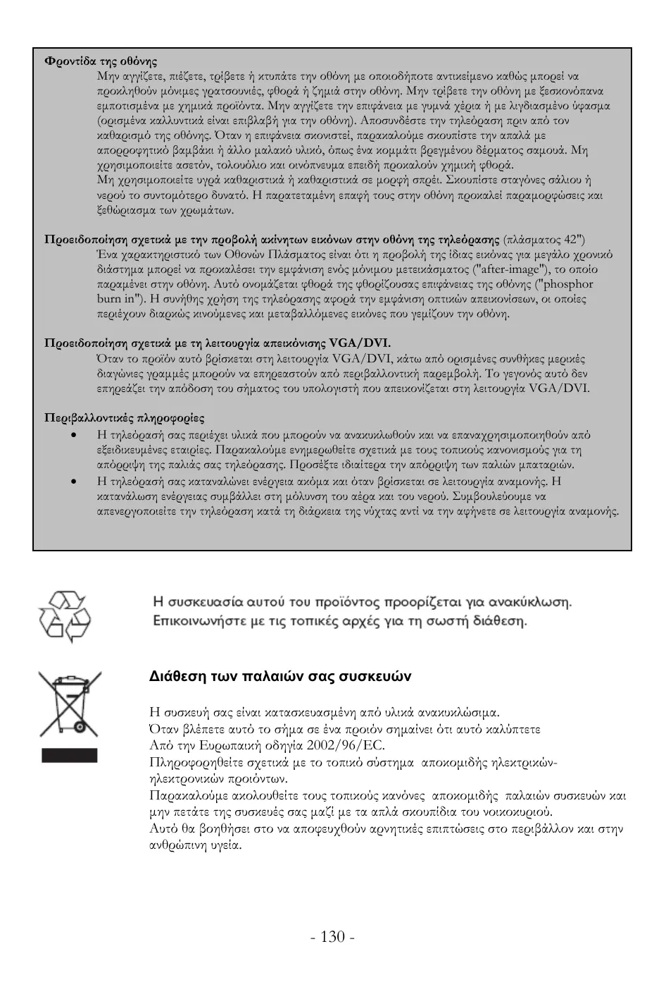 1. 2. Aviso concerniente a imágenes fijas en la pantalla del televisor (42” Plasma) Es característico de las pantallas de Plasma que imágenes fijas que se muestran durante un largo periodo de tiempo se queden grabadas en la pantalla. Este efecto se llama quemado del fósforo. Normalmente el uso del televisor con pantalla de plasma supone la reproducción de imagines con movimiento continuo e imagines cambiantes que ocupan toda la pantalla. Aviso concerniente a los modos de visualización VGA/DVI Mientras el televisor este en modo de visualización VGA/DVI es posible que aparezcan líneas diagonales en la pantalla debido a interferencia ambiental. Estas interferencias no afectaran la calidad de la señal del ordenador que se visualice en modo VGA/DVI Medioambiente • Su televisor contiene materiales que pueden ser reciclados y reusados por compañías especializadas. Por favor infórmese sobre las regulaciones locales para la disposición de su viejo televisor, en especial la disposición de las baterías gastadas. • Su televisor consume energía en el modo Stand-by. Consumo de energía contribuye a la polución del aire y agua. Aconsejamos que apague su televisor por la noche en vez de dejarlo en el modo Stand-by