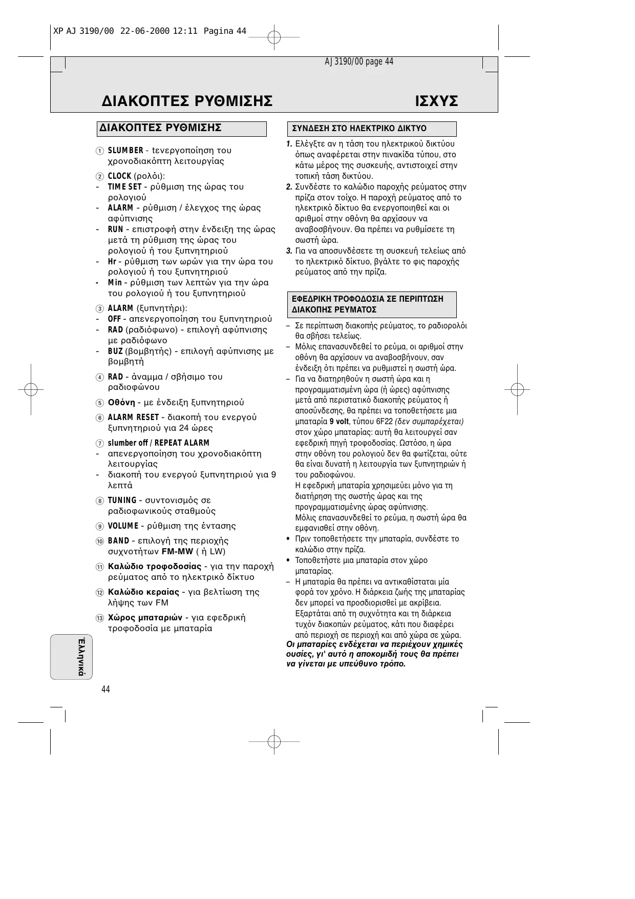Téléchargez la notice de votre Ραδιορολόι au format PDF gratuitement ! Retrouvez votre notice AJ3190 - PHILIPS et reprennez votre appareil électronique en main. Sur cette page sont publiés tous les documents nécessaires à l'utilisation de votre appareil AJ3190 de la marque PHILIPS.