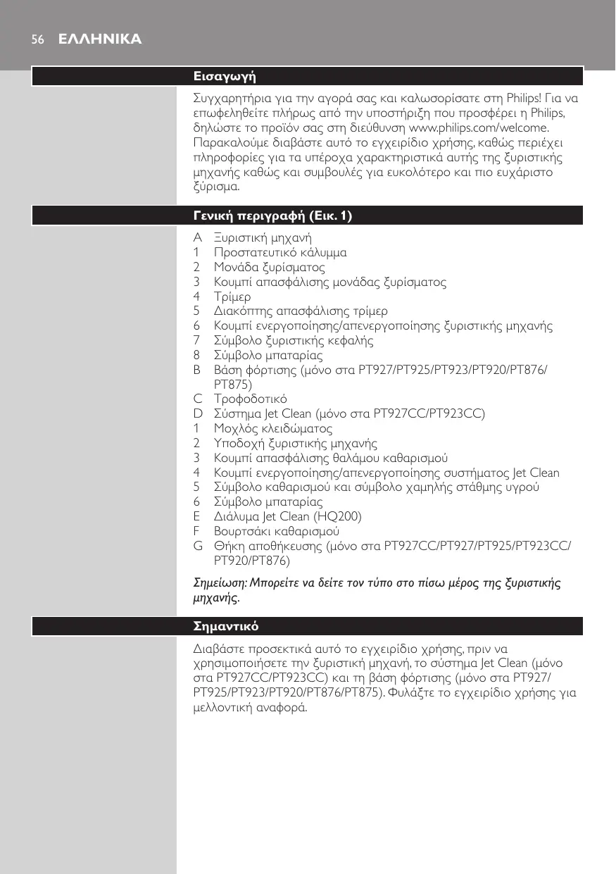 Διαβάστε προσεκτικά αυτό το εγχειρίδιο χρήσης, πριν να χρησιμοποιήσετε την ξυριστική μηχανή, το σύστημα Jet Clean (μόνο στα PT927CC/PT923CC) και τη βάση φόρτισης (μόνο στα PT927/ PT925/PT923/PT920/PT876/PT875). Φυλάξτε το εγχειρίδιο χρήσης για μελλοντική αναφορά.