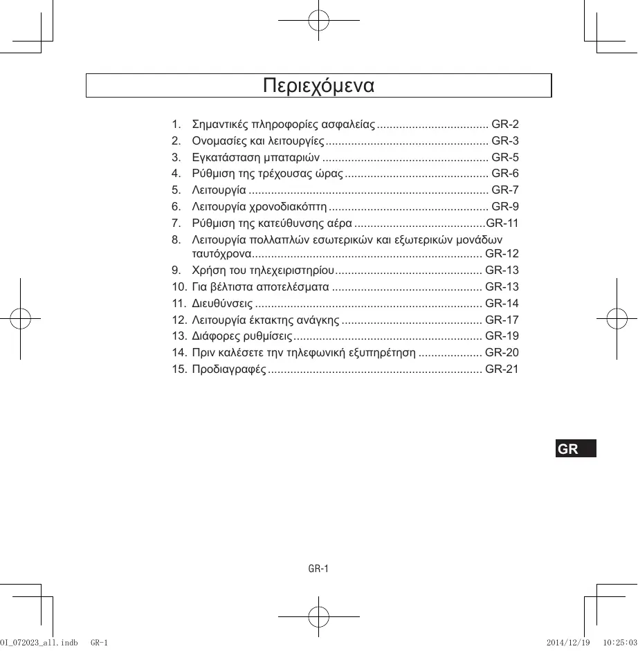 Σημαντικές πληροφορίες ασφαλείας GR-2 Ονομασίες και λειτουργίες GR-3 Εγκατάσταση μπαταριών GR-5 Ρύθμιση της τρέχουσας ώρας GR-6 Λειτουργία GR-7 Λειτουργία χρονοδιακόπτη GR-9 Ρύθμιση της κατεύθυνσης αέρα GR-11 Λειτουργία πολλαπλών εσωτερικών και εξωτερικών μονάδων ταυτόχρονα GR-12 Χρήση του τηλεχειριστηρίου GR-13 Για βέλτιστα αποτελέσματα GR-13 Διευθύνσεις GR-14 Λειτουργία έκτακτης ανάγκης GR-17 Διάφορες ρυθμίσεις GR-19 Πριν καλέσετε την τηλεφωνική εξυπηρέτηση GR-20 Προδιαγραφές GR-21