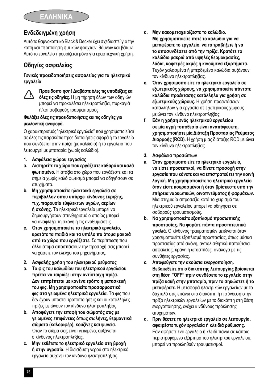 ΕΛΛΗΝΙΚΑ Αυτό το εργαλείο δεν προορίζεται για χρήση από άτομα (στα οποία περιλαμβάνονται και τα παιδιά) με μειωμένες φυσικές, αντιληπτικές ή διανοητικές ικανότητες, ή άτομα χωρίς εμπειρία και γνώσεις, παρά μόνο εφόσον επιτηρούνται ή τους έχουν δοθεί οδηγίες σχετικά με τη χρήση της συσκευής από άτομο υπεύθυνο για την ασφάλεια τους. Τα παιδιά πρέπει να επιτηρούνται ώστε να είστε σίγουρος ότι δεν παίζουν με το εργαλείο. Η ενδεδειγμένη χρήση περιγράφεται σε αυτό το εγχειρίδιο οδηγιών. Η χρήση οποιουδήποτε αξεσουάρ ή προσαρτήματος ή η εκτέλεση οποιασδήποτε εργασίας με αυτό το εργαλείο, διαφορετικής από αυτές που συστήνονται στο παρόν εγχειρίδιο οδηγιών ενδέχεται να εγκυμονεί κίνδυνο τραυματισμού και/ή ζημιάς σε ιδιοκτησία. Αποφεύγετε την ακούσια ενεργοποίηση του εργαλείου. Μη μεταφέρετε το εργαλείο με το χέρι ή το δάχτυλό σας στην μπροστινή λαβή ή το διακόπτη-σκανδάλη εάν προηγουμένως το εργαλείο δεν έχει αποσυνδεθεί από την πρίζα ή δεν έχει αφαιρεθεί η μπαταρία. Bεβαιωθείτε ότι το εργαλείο είναι απενεργοποιημένο όταν το συνδέετε στην πρίζα. Εάν δεν έχετε χρησιμοποιήσει ξανά θαμνοκοπτικό, καλό θα είναι να ζητήσετε πρακτικές οδηγίες από έναν έμπειρο χρήστη πέρα από τη μελέτη του παρόντος εγχειριδίου. Μην αγγίζετε ποτέ τις λεπίδες ενώ το εργαλείο βρίσκεται σε λειτουργία. Μην επιχειρήσετε ποτέ να ακινητοποιήσετε τις λεπίδες εξαναγκαστικά. Μην τοποθετείτε κάτω το εργαλείο πριν να ακινητοποιηθούν εντελώς οι λεπίδες. Ελέγχετε τακτικά τις λεπίδες για ζημιές και φθορές. Μη χρησιμοποιείτε το εργαλείο εάν οι λεπίδες έχουν υποστεί ζημιά. Εάν τυχόν το εργαλείο αρχίσει να δονείται με μη φυσιολογικό τρόπο, απενεργοποιήστε το αμέσως και ελέγξτε το για τυχόν ζημιά. Εάν το εργαλείο σταματήσει απότομα να λειτουργεί, απενεργοποιήστε το. Αποσυνδέστε το εργαλείο από την πρίζα ή αφαιρέστε την μπαταρία πριν επιχειρήσετε να αφαιρέσετε οποιοδήποτε εμπόδιο. Μετά τη χρήση, τοποθετήστε στις λεπίδες την παρεχόμενη θήκη λεπίδων. Αποθηκεύστε το εργαλείο, αφού βεβαιωθείτε ότι η λεπίδα δεν είναι εκτεθειμένη. Πάντοτε να βεβαιώνεστε ότι όλα τα προστατευτικά είναι τοποθετημένα στο εργαλείο όταν το χρησιμοποιείτε. Μην επιχειρήσετε να χρησιμοποιήσετε το εργαλείο εάν λείπουν εξαρτήματα από αυτό ή εάν έχει υποβληθεί σε μη εξουσιοδοτημένες τροποποιήσεις.