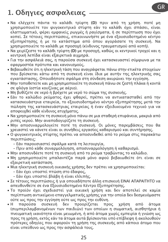 • Να ελέγχετε άντα το καλάθι τρίφτη (D) ριν αό τη χρήση. οτέ µη χρησιµοοιείτε τον φυγοκεντρικό στίφτη εάν το καλάθι έχει σάσει, είναι ελαττωµατικό, φέρει εµφανείς ρωγµές ή ραγίσµατα, ή σε ερίτωση ου έχει κοεί. Σε τέτοιες εριτώσεις, εικοινωνήστε µε ένα εξουσιοδοτηµένο κέντρο εξυηρέτησης ή µε το κατάστηµα αό όου αγοράσατε τη συσκευή. Να χρησιµοοιείτε το καλάθι µε ροσοχή (κίνδυνος τραυµατισµού αό κοή). • Να χειρίζεστε το καλάθι τρίφτη (D) µε ροσοχή, καθώς οι κεντρικοί τροχοί και η κεντρική λείδα είναι εξαιρετικά αιχµηρά. • Για την ασφάλειά σας, η αρούσα συσκευή έχει κατασκευαστεί σύµφωνα µε τα εφαρµοστέα ρότυα και κανονισµούς. • Βεβαιωθείτε ότι η ηλεκτρική τάση ου αναγράφεται άνω στην ετικέτα στοιχείων ου βρίσκεται κάτω αό τη συσκευή είναι ίδια µε αυτήν της ηλεκτρικής σας εγκατάστασης. Οοιοδήοτε σφάλµα στη σύνδεση ακυρώνει την εγγύηση. • Μην τοοθετείτε και µη χρησιµοοιείτε τη συσκευή άνω σε ζεστή λάκα ή κοντά σε φλόγα (εστία κουζίνας µε αέριο). • Μη βυθίζετε σε νερό ή βρέχετε µε νερό το σώµα της συσκευής. • Εάν το καλώδιο ρεύµατος έχει φθαρεί, ρέει να αντικατασταθεί αό την κατασκευάστρια εταιρεία, το εξουσιοδοτηµένο κέντρο εξυηρέτησης µετά την ώληση της κατασκευάστριας εταιρείας ή έναν εξειδικευµένο τεχνικό για να αοφευχθεί κάθε κίνδυνος ατυχήµατος. • Να χρησιµοοιείτε τη συσκευή µόνο άνω σε µια σταθερή ειφάνεια, µακριά αό ριές νερού. Μην αναοδογυρίζετε τη συσκευή. • Μην αοσυναρµολογείτε οτέ τη συσκευή. Οι µόνες αρεµβάσεις ου θα χρειαστεί να κάνετε είναι οι συνήθεις εργασίες καθαρισµού και συντήρησης. • Ο φυγοκεντρικός στίφτης ρέει να αοσυνδεθεί αό το ρεύµα στις αρακάτω εριτώσεις: - Εάν αρουσιαστεί σφάλµα κατά τη λειτουργία, - Πριν αό κάθε συναρµολόγηση, αοσυναρµολόγηση ή καθαρισµό. • Μην αοσυνδέετε οτέ τη συσκευή αό το ρεύµα τραβώντας το καλώδιο. • Μη χρησιµοοιείτε µαλαντέζα αρά µόνο αφού βεβαιωθείτε ότι είναι σε εξαιρετική κατάσταση. • Μια ηλεκτρική συσκευή οικιακής χρήσης δεν ρέει να χρησιµοοιείται: - Εάν έχει υοστεί τώση στο έδαφος, - Εάν έχει υοστεί βλάβη ή είναι ελλιής. • Σε τέτοιες εριτώσεις ή για οοιαδήοτε άλλη εισκευή ΕΙΝΑΙ ΑΠΑΡΑΙΤΗΤΟ να αευθυνθείτε σε ένα Εξουσιοδοτηµένο Κέντρο Εξυηρέτησης. • Το ροRόν έχει σχεδιαστεί για οικιακή χρήση και δεν αοτελεί σε καµία ερίτωση αντικείµενο εαγγελµατικής χρήσης για την οοία δεν δεσµευόµαστε ούτε ως ρος την εγγύηση ούτε ως ρος την ευθύνη. • Η αρούσα συσκευή δεν ροορίζεται ρος χρήση αό άτοµα (συµεριλαµβανοµένων των αιδιών) των οοίων η σωµατική, αισθητήρια ή νευµατική ικανότητα είναι µειωµένη, ή αό άτοµα χωρίς εµειρία ή γνώση ως ρος τη χρήση, εκτός εάν τα άτοµα αυτά βρίσκονται υό είβλεψη ή ακολουθούν ρότερες οδηγίες ου αφορούν τη χρήση της συσκευής αό κάοιο άτοµο ου είναι υεύθυνο ως ρος την ασφάλειά τους.