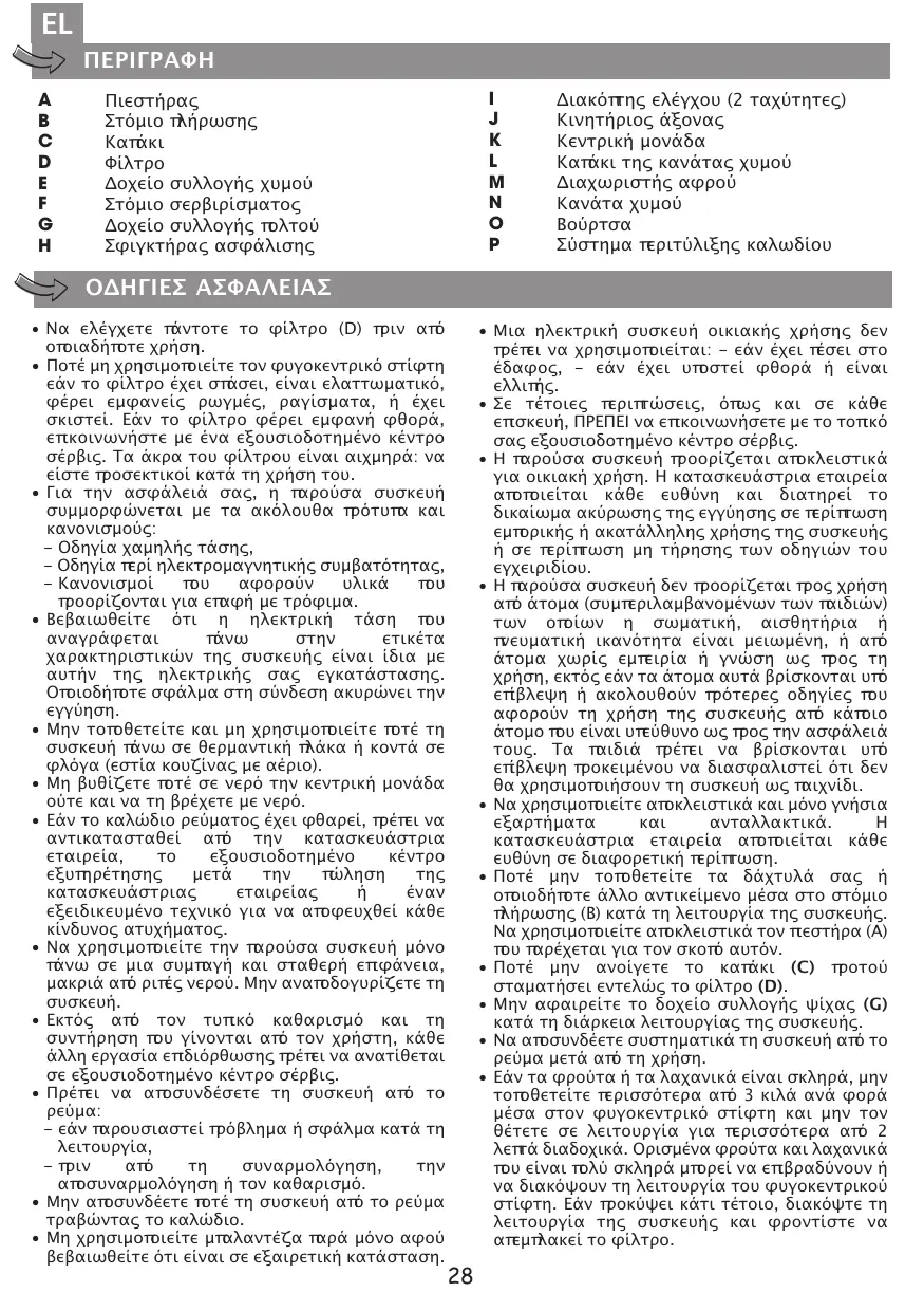 ΟΔΗΓΙΕΣ ΑΣΦΑΛΕΙΑΣ • Να ελέγχετε ̟άντοτε το φίλτρο (D) ̟ριν α̟ό ο̟οιαδή̟οτε χρήση. • Ποτέ µη χρησιµο̟οιείτε τον φυγοκεντρικό στίφτη εάν το φίλτρο έχει σ̟άσει, είναι ελαττωµατικό, φέρει εµφανείς ρωγµές, ραγίσµατα, ή έχει σκιστεί. Εάν το φίλτρο φέρει εµφανή φθορά, ε̟ικοινωνήστε µε ένα εξουσιοδοτηµένο κέντρο σέρβις. Τα άκρα του φίλτρου είναι αιχµηρά: να είστε ̟ροσεκτικοί κατά τη χρήση του. • Για την ασφάλειά σας, η ̟αρούσα συσκευή συµµορφώνεται µε τα ακόλουθα ̟ρότυ̟α και κανονισµούς: - Οδηγία χαµηλής τάσης, - Οδηγία ̟ερί ηλεκτροµαγνητικής συµβατότητας, - Κανονισµοί ̟ου αφορούν υλικά ̟ου ̟ροορίζονται για ε̟αφή µε τρόφιµα. • Βεβαιωθείτε ότι η ηλεκτρική τάση ̟ου αναγράφεται ̟άνω στην ετικέτα χαρακτηριστικών της συσκευής είναι ίδια µε αυτήν της ηλεκτρικής σας εγκατάστασης. Ο̟οιοδή̟οτε σφάλµα στη σύνδεση ακυρώνει την εγγύηση. • Μην το̟οθετείτε και µη χρησιµο̟οιείτε ̟οτέ τη συσκευή ̟άνω σε θερµαντική ̟λάκα ή κοντά σε φλόγα (εστία κουζίνας µε αέριο). • Μη βυθίζετε ̟οτέ σε νερό την κεντρική µονάδα ούτε και να τη βρέχετε µε νερό. • Εάν το καλώδιο ρεύµατος έχει φθαρεί, ̟ρέ̟ει να αντικατασταθεί α̟ό την κατασκευάστρια εταιρεία, το εξουσιοδοτηµένο κέντρο εξυ̟ηρέτησης µετά την ̟ώληση της κατασκευάστριας εταιρείας ή έναν εξειδικευµένο τεχνικό για να α̟οφευχθεί κάθε κίνδυνος ατυχήµατος. • Να χρησιµο̟οιείτε την ̟αρούσα συσκευή µόνο ̟άνω σε µια συµ̟αγή και σταθερή ε̟ιφάνεια, µακριά α̟ό ρι̟ές νερού. Μην ανα̟οδογυρίζετε τη συσκευή. • Εκτός α̟ό τον τυ̟ικό καθαρισµό και τη συντήρηση ̟ου γίνονται α̟ό τον χρήστη, κάθε άλλη εργασία ε̟ιδιόρθωσης ̟ρέ̟ει να ανατίθεται σε εξουσιοδοτηµένο κέντρο σέρβις. • Πρέ̟ει να α̟οσυνδέσετε τη συσκευή α̟ό το ρεύµα: - εάν ̟αρουσιαστεί ̟ρόβληµα ή σφάλµα κατά τη λειτουργία, - ̟ριν α̟ό τη συναρµολόγηση, την α̟οσυναρµολόγηση ή τον καθαρισµό. • Μην α̟οσυνδέετε ̟οτέ τη συσκευή α̟ό το ρεύµα τραβώντας το καλώδιο. • Μη χρησιµο̟οιείτε µ̟αλαντέζα ̟αρά µόνο αφού βεβαιωθείτε ότι είναι σε εξαιρετική κατάσταση.