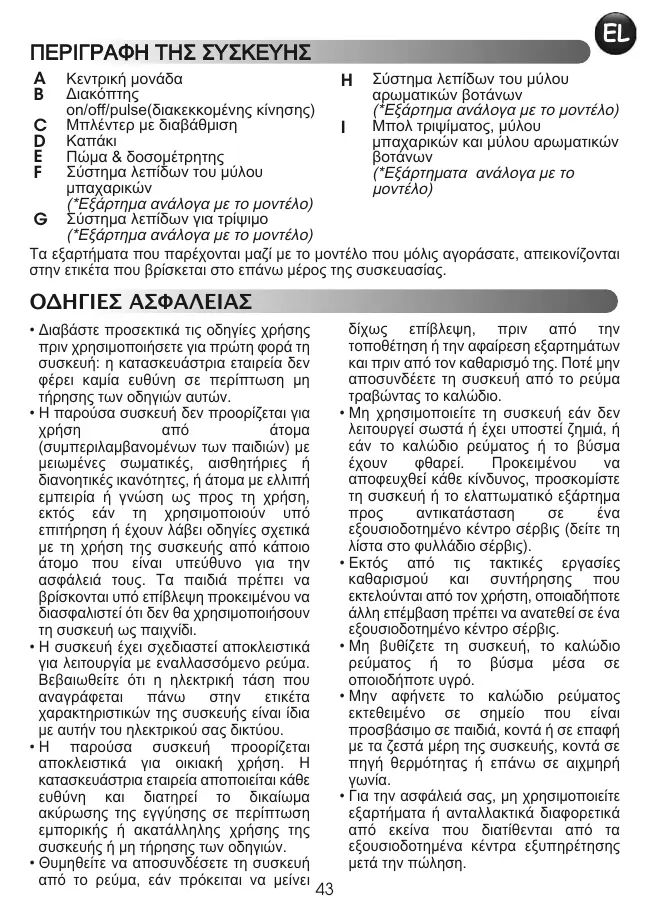 ΟΔΗΓΙΕΣ ΑΣΦΑΛΕΙΑΣ • Διαβάστε προσεκτικά τις οδηγίες χρήσης πριν χρησιμοποιήσετε για πρώτη φορά τη συσκευή: η κατασκευάστρια εταιρεία δεν φέρει καμία ευθύνη σε περίπτωση μη τήρησης των οδηγιών αυτών. • Η παρούσα συσκευή δεν προορίζεται για χρήση από άτομα (συμπεριλαμβανομένων των παιδιών) με μειωμένες σωματικές, αισθητήριες ή διανοητικές ικανότητες, ή άτομα με ελλιπή εμπειρία ή γνώση ως προς τη χρήση, εκτός εάν τη χρησιμοποιούν υπό επιτήρηση ή έχουν λάβει οδηγίες σχετικά με τη χρήση της συσκευής από κάποιο άτομο που είναι υπεύθυνο για την ασφάλειά τους. Τα παιδιά πρέπει να βρίσκονται υπό επίβλεψη προκειμένου να διασφαλιστεί ότι δεν θα χρησιμοποιήσουν τη συσκευή ως παιχνίδι. • Η συσκευή έχει σχεδιαστεί αποκλειστικά για λειτουργία με εναλλασσόμενο ρεύμα. Βεβαιωθείτε ότι η ηλεκτρική τάση που αναγράφεται πάνω στην ετικέτα χαρακτηριστικών της συσκευής είναι ίδια με αυτήν του ηλεκτρικού σας δικτύου. • Η παρούσα συσκευή προορίζεται αποκλειστικά για οικιακή χρήση. Η κατασκευάστρια εταιρεία αποποιείται κάθε ευθύνη και διατηρεί το δικαίωμα ακύρωσης της εγγύησης σε περίπτωση εμπορικής ή ακατάλληλης χρήσης της συσκευής ή μη τήρησης των οδηγιών. • Θυμηθείτε να αποσυνδέσετε τη συσκευή από το ρεύμα, εάν πρόκειται να μείνει
