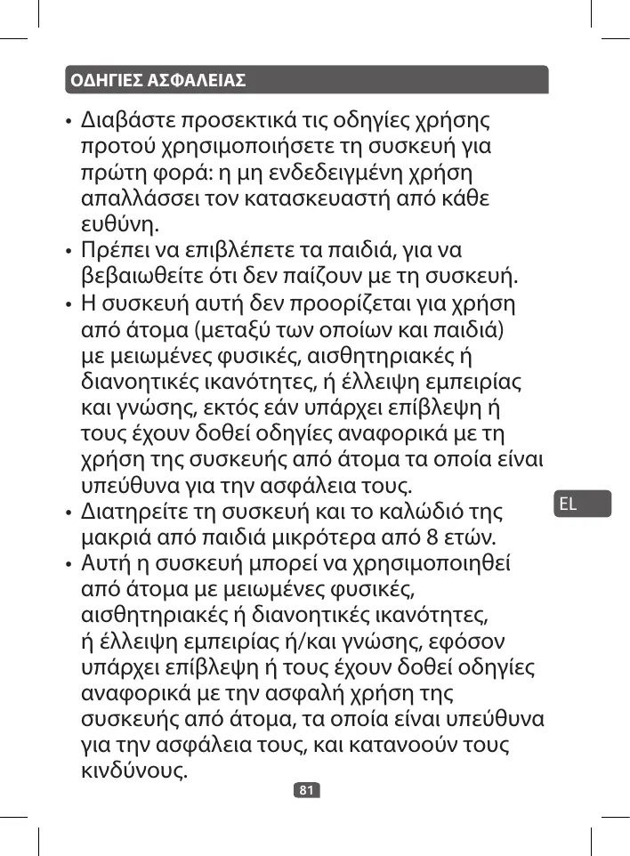 • Διαβάστε προσεκτικά τις οδηγίες χρήσης προτού χρησιμοποιήσετε τη συσκευή για πρώτη φορά: η μη ενδεδειγμένη χρήση απαλλάσσει τον κατασκευαστή από κάθε ευθύνη. • Πρέπει να επιβλέπετε τα παιδιά, για να βεβαιωθείτε ότι δεν παίζουν με τη συσκευή. • Η συσκευή αυτή δεν προορίζεται για χρήση από άτομα (μεταξύ των οποίων και παιδιά) με μειωμένες φυσικές, αισθητηριακές ή διανοητικές ικανότητες, ή έλλειψη εμπειρίας και γνώσης, εκτός εάν υπάρχει επίβλεψη ή τους έχουν δοθεί οδηγίες αναφορικά με τη χρήση της συσκευής από άτομα τα οποία είναι υπεύθυνα για την ασφάλεια τους. • Διατηρείτε τη συσκευή και το καλώδιό της μακριά από παιδιά μικρότερα από 8 ετών. • Αυτή η συσκευή μπορεί να χρησιμοποιηθεί από άτομα με μειωμένες φυσικές, αισθητηριακές ή διανοητικές ικανότητες, ή έλλειψη εμπειρίας ή/και γνώσης, εφόσον υπάρχει επίβλεψη ή τους έχουν δοθεί οδηγίες αναφορικά με την ασφαλή χρήση της συσκευής από άτομα, τα οποία είναι υπεύθυνα για την ασφάλεια τους, και κατανοούν τους κινδύνους. 81