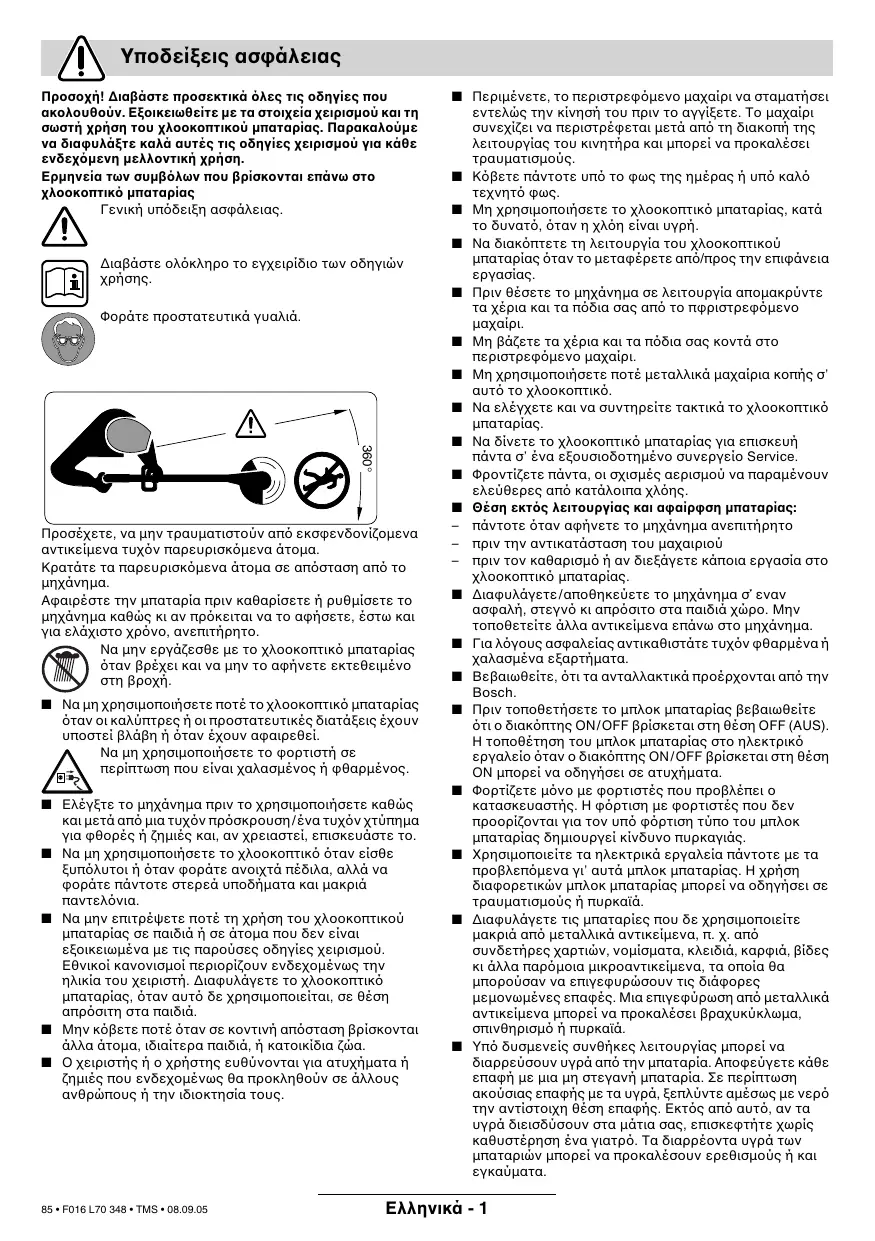 ■ Περιµένετε, το περιστρεφ µενο µαχαίρι να σταµατήσει εντελώς την κίνησή του πριν το αγγίξετε. Το µαχαίρι συνεχίζει να περιστρέφεται µετά απ τη διακοπή της λειτουργίας του κινητήρα και µπορεί να προκαλέσει τραυµατισµούς. ■ Κ βετε πάντοτε υπ το φως της ηµέρας ή υπ καλ τεχνητ φως. ■ Μη χρησιµοποιήσετε το χλοοκοπτικ µπαταρίας, κατά το δυνατ , ταν η χλ η είναι υγρή. ■ Να διακ πτετε τη λειτουργία του χλοοκοπτικού µπαταρίας ταν το µεταφέρετε απ /προς την επιφάνεια εργασίας. ■ Πριν θέσετε το µηχάνηµα σε λειτουργία αποµακρύντε τα χέρια και τα π δια σας απ το πφριστρεφ µενο µαχαίρι. ■ Μη βάζετε τα χέρια και τα π δια σας κοντά στο περιστρεφ µενο µαχαίρι. ■ Μη χρησιµοποιήσετε ποτέ µεταλλικά µαχαίρια κοπής σ’ αυτ το χλοοκοπτικ . ■ Να ελέγχετε και να συντηρείτε τακτικά το χλοοκοπτικ µπαταρίας. ■ Να δίνετε το χλοοκοπτικ µπαταρίας για επισκευή πάντα σ’ ένα εξουσιοδοτηµένο συνεργείο Service. ■ Φροντίζετε πάντα, οι σχισµές αερισµού να παραµένουν ελεύθερες απ κατάλοιπα χλ ης. ■ Θέση εκτς λειτουργίας και αφαίρφση µπαταρίας: – πάντοτε ταν αφήνετε το µηχάνηµα ανεπιτήρητο – πριν την αντικατάσταση του µαχαιριού – πριν τον καθαρισµ ή αν διεξάγετε κάποια εργασία στο χλοοκοπτικ µπαταρίας. ■ ∆ιαφυλάγετε/αποθηκεύετε το µηχάνηµα σ΄ εναν ασφαλή, στεγν κι απρ σιτο στα παιδιά χώρο. Μην τοποθετείτε άλλα αντικείµενα επάνω στο µηχάνηµα. ■ Για λ γους ασφαλείας αντικαθιστάτε τυχ ν φθαρµένα ή χαλασµένα εξαρτήµατα. ■ Βεβαιωθείτε, τι τα ανταλλακτικά προέρχονται απ την Bosch. ■ Πριν τοποθετήσετε το µπλοκ µπαταρίας βεβαιωθείτε τι ο διακ πτης ON/OFF βρίσκεται στη θέση OFF (AUS). Η τοποθέτηση του µπλοκ µπαταρίας στο ηλεκτρικ εργαλείο ταν ο διακ πτης ON /OFF βρίσκεται στη θέση OΝ µπορεί να οδηγήσει σε ατυχήµατα. ■ Φορτίζετε µ νο µε φορτιστές που προβλέπει ο κατασκευαστής. Η φ ρτιση µε φορτιστές που δεν προορίζονται για τον υπ φ ρτιση τύπο του µπλοκ µπαταρίας δηµιουργεί κίνδυνο πυρκαγιάς. ■ Χρησιµοποιείτε τα ηλεκτρικά εργαλεία πάντοτε µε τα προβλεπ µενα γι’ αυτά µπλοκ µπαταρίας. Η χρήση διαφορετικών µπλοκ µπαταρίας µπορεί να οδηγήσει σε τραυµατισµούς ή πυρκαϊά. ■ ∆ιαφυλάγετε τις µπαταρίες που δε χρησιµοποιείτε µακριά απ µεταλλικά αντικείµενα, π. χ. απ συνδετήρες χαρτιών, νοµίσµατα, κλειδιά, καρφιά, βίδες κι άλλα παρ µοια µικροαντικείµενα, τα οποία θα µπορούσαν να επιγεφυρώσουν τις διάφορες µεµονωµένες επαφές. Μια επιγεφύρωση απ µεταλλικά αντικείµενα µπορεί να προκαλέσει βραχυκύκλωµα, σπινθηρισµ ή πυρκαϊά. ■ Υπ δυσµενείς συνθήκες λειτουργίας µπορεί να διαρρεύσουν υγρά απ την µπαταρία. Αποφεύγετε κάθε επαφή µε µια µη στεγανή µπαταρία. Σε περίπτωση ακούσιας επαφής µε τα υγρά, ξεπλύντε αµέσως µε νερ την αντίστοιχη θέση επαφής. Εκτ ς απ αυτ , αν τα υγρά διεισδύσουν στα µάτια σας, επισκεφτήτε χωρίς καθυστέρηση ένα γιατρ . Τα διαρρέοντα υγρά των µπαταριών µπορεί να προκαλέσουν ερεθισµούς ή και εγκαύµατα.