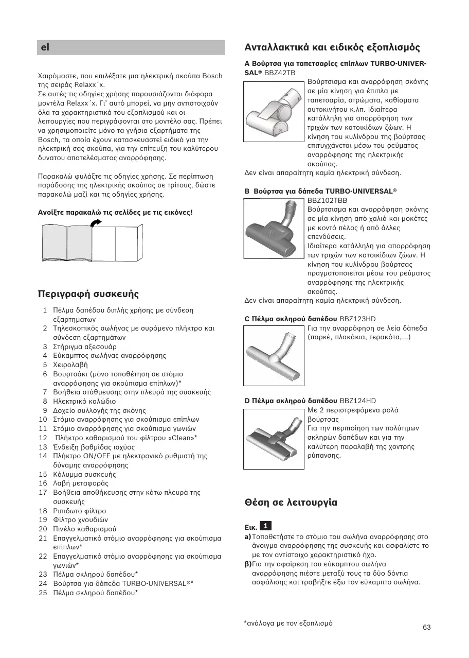 Congratulations on your purchase of the Bosch Relaxx´x vacuum cleaner. This instruction manual describes various Relaxx´x models, which means that some of the equipment features and functions described may not apply to your model. You should only use original Bosch accessories, which have been specially developed for your vacuum cleaner, to achieve the best possible vacuuming results. Please keep this instruction manual for future reference. If you pass the vacuum cleaner on to someone else, please also pass on this instruction manual. Fold out the picture pages. de
