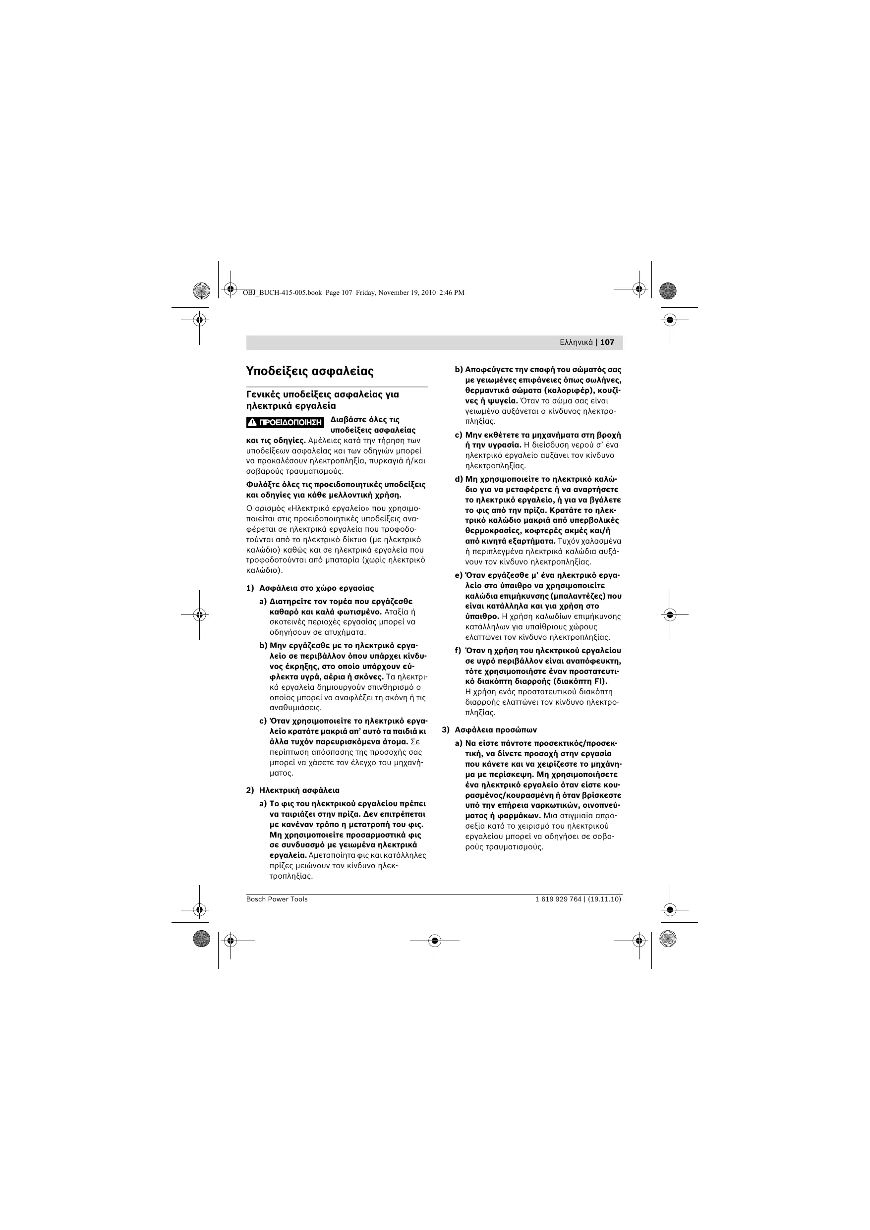 a) Να είστε πάντοτε προσεκτικός/προσεκτική, να δίνετε προσοχή στην εργασία που κάνετε και να χειρίζεστε το μηχάνημα με περίσκεψη. Μη χρησιμοποιήσετε ένα ηλεκτρικό εργαλείο όταν είστε κουρασμένος/κουρασμένη ή όταν βρίσκεστε υπό την επήρεια ναρκωτικών, οινοπνεύματος ή φαρμάκων. Μια στιγμιαία απροσεξία κατά το χειρισμό του ηλεκτρικού εργαλείου μπορεί να οδηγήσει σε σοβαρούς τραυματισμούς. 1 619 929 764 | (19.11.10) OBJ_BUCH-415-005.book Page 108 Friday, November 19, 2010 2:46 PM 108 | Eλληνικά b) Φοράτε έναν κατάλληλο για σας προστατευτικό εξοπλισμό και πάντοτε προστατευτικά γυαλιά. Όταν φοράτε έναν κατάλληλο προστατευτικό εξοπλισμό όπως μάσκα προστασίας από σκόνη, αντιολισθητικά υποδήματα ασφαλείας, προστατευτικό κράνος ή ωτασπίδες, ανάλογα με το εκάστοτε εργαλείο και τη χρήση του, ελαττώνεται ο κίνδυνος τραυματισμών. c) Αποφεύγετε την αθέλητη εκκίνηση. Βεβαιωθείτε ότι το ηλεκτρικό εργαλείο έχει αποζευχτεί πριν το συνδέσετε με το ηλεκτρικό δίκτυο ή με την μπαταρία καθώς και πριν το παραλάβετε ή το μεταφέρετε. Όταν μεταφέρετε το ηλεκτρικό εργαλείο έχοντας το δάχτυλό σας στο διακόπτη ή όταν συνδέσετε το μηχάνημα με την πηγή ρεύματος όταν αυτό είναι ακόμη στη θέση ΟΝ, τότε δημιουργείται κίνδυνος τραυματισμών. d) Αφαιρείτε από τα ηλεκτρικά εργαλεία τυχόν συναρμολογημένα εργαλεία ρύθμισης ή κλειδιά πριν θέσετε το ηλεκτρικό εργαλείο σε λειτουργία. Ένα εργαλείο ή κλειδί συναρμολογημένο σ’ ένα περιστρεφόμενο τμήμα ενός μηχανήματος μπορεί να οδηγήσει σε τραυματισμούς. e) Μην υπερεκτιμάτε τον εαυτό σας. Φροντίζετε για την ασφαλή στάση του σώματός σας και διατηρείτε πάντοτε την ισορροπία σας. Έτσι μπορείτε να ελέγξετε καλύτερα το μηχάνημα σε περιπτώσεις απροσδόκητων περιστάσεων. f) Φοράτε κατάλληλα ενδύματα. Μη φοράτε φαρδιά ρούχα ή κοσμήματα. Κρατάτε τα μαλλιά σας, τα ρούχα σας και τα γάντια σας μακριά από κινούμενα εξαρτήματα. Χαλαρή ενδυμασία, κοσμήματα ή μακριά μαλλιά μπορεί να εμπλακούν στα κινούμενα εξαρτήματα. g) Όταν υπάρχει η δυνατότητα συναρμολόγησης διατάξεων αναρρόφησης ή συλλογής σκόνης, βεβαιωθείτε ότι αυτές είναι συνδεμένες με το μηχάνημα καθώς και ότι χρησιμοποιούνται σωστά. Η χρήση μιας αναρρόφησης σκόνης μπορεί να ελαττώσει τον κίνδυνο που προκαλείται από τη