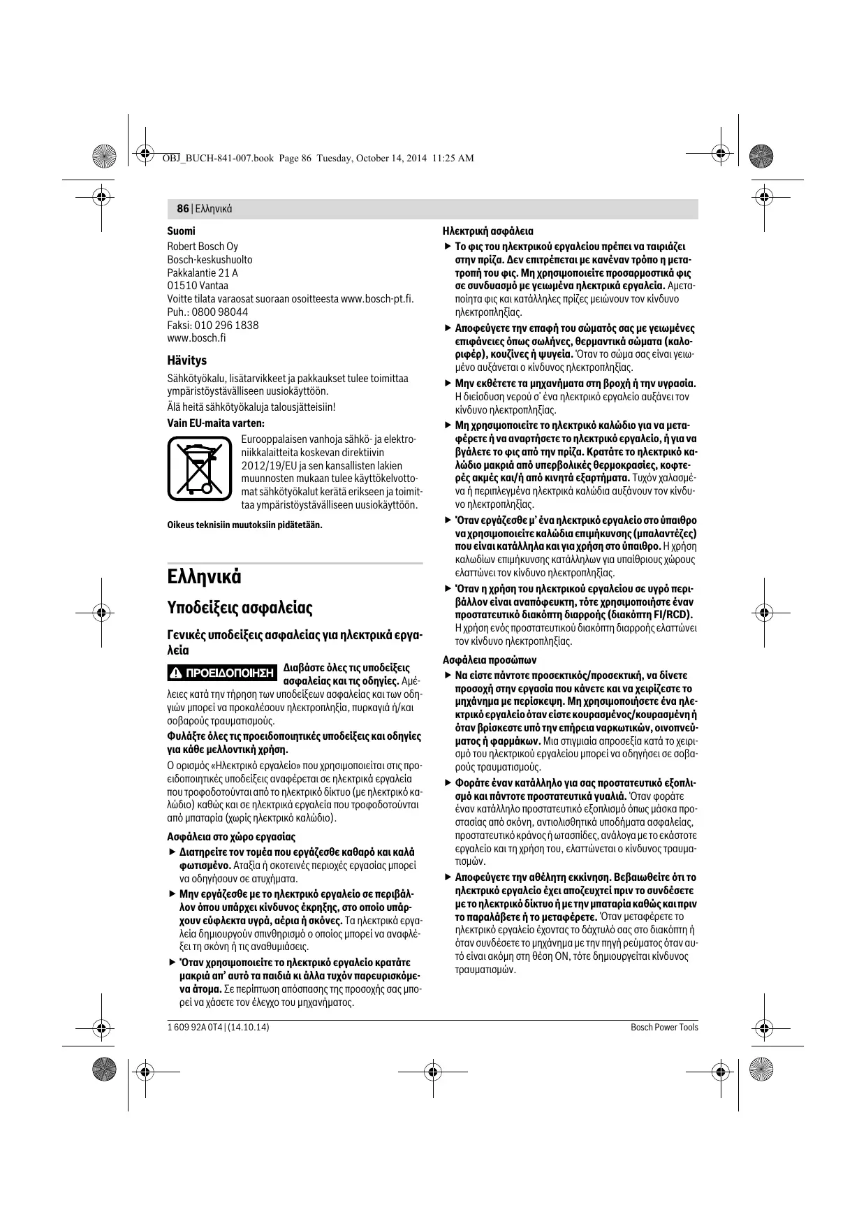 Υποδείξεις ασφαλείας Γενικές υποδείξεις ασφαλείας για ηλεκτρικά εργαλεία Διαβάστε όλες τις υποδείξεις ασφαλείας και τις οδηγίες. Αμέλειες κατά την τήρηση των υποδείξεων ασφαλείας και των οδηγιών μπορεί να προκαλέσουν ηλεκτροπληξία, πυρκαγιά ή/και σοβαρούς τραυματισμούς. Φυλάξτε όλες τις προειδοποιητικές υποδείξεις και οδηγίες για κάθε μελλοντική χρήση. Ο ορισμός «Ηλεκτρικό εργαλείο» που χρησιμοποιείται στις προειδοποιητικές υποδείξεις αναφέρεται σε ηλεκτρικά εργαλεία που τροφοδοτούνται από το ηλεκτρικό δίκτυο (με ηλεκτρικό καλώδιο) καθώς και σε ηλεκτρικά εργαλεία που τροφοδοτούνται από μπαταρία (χωρίς ηλεκτρικό καλώδιο). Ασφάλεια στο χώρο εργασίας Διατηρείτε τον τομέα που εργάζεσθε καθαρό και καλά φωτισμένο. Αταξία ή σκοτεινές περιοχές εργασίας μπορεί να οδηγήσουν σε ατυχήματα. Μην εργάζεσθε με το ηλεκτρικό εργαλείο σε περιβάλλον όπου υπάρχει κίνδυνος έκρηξης, στο οποίο υπάρχουν εύφλεκτα υγρά, αέρια ή σκόνες. Τα ηλεκτρικά εργαλεία δημιουργούν σπινθηρισμό ο οποίος μπορεί να αναφλέξει τη σκόνη ή τις αναθυμιάσεις. Όταν χρησιμοποιείτε το ηλεκτρικό εργαλείο κρατάτε μακριά απ’ αυτό τα παιδιά κι άλλα τυχόν παρευρισκόμενα άτομα. Σε περίπτωση απόσπασης της προσοχής σας μπορεί να χάσετε τον έλεγχο του μηχανήματος. 1 609 92A 0T4 | (14.10.14) Ηλεκτρική ασφάλεια Το φις του ηλεκτρικού εργαλείου πρέπει να ταιριάζει στην πρίζα. Δεν επιτρέπεται με κανέναν τρόπο η μετατροπή του φις. Μη χρησιμοποιείτε προσαρμοστικά φις σε συνδυασμό με γειωμένα ηλεκτρικά εργαλεία. Αμεταποίητα φις και κατάλληλες πρίζες μειώνουν τον κίνδυνο ηλεκτροπληξίας. Αποφεύγετε την επαφή του σώματός σας με γειωμένες επιφάνειες όπως σωλήνες, θερμαντικά σώματα (καλοριφέρ), κουζίνες ή ψυγεία. Όταν το σώμα σας είναι γειωμένο αυξάνεται ο κίνδυνος ηλεκτροπληξίας. Μην εκθέτετε τα μηχανήματα στη βροχή ή την υγρασία. Η διείσδυση νερού σ’ ένα ηλεκτρικό εργαλείο αυξάνει τον κίνδυνο ηλεκτροπληξίας. Μη χρησιμοποιείτε το ηλεκτρικό καλώδιο για να μεταφέρετε ή να αναρτήσετε το ηλεκτρικό εργαλείο, ή για να βγάλετε το φις από την πρίζα. Κρατάτε το ηλεκτρικό καλώδιο μακριά από υπερβολικές θερμοκρασίες, κοφτερές ακμές και/ή από κινητά εξαρτήματα. Τυχόν χαλασμένα ή περιπλεγμένα ηλεκτρικά καλώδια αυξάνουν τον κίνδυνο ηλεκτροπληξίας. Όταν εργάζεσθε μ’ ένα ηλεκτρικό εργαλείο στο ύπαιθρο να χρησιμοποιείτε καλώδια επιμήκυνσης (μπαλαντέζες) που είναι κατάλληλα και για χρήση στο ύπαιθρο. Η χρήση καλωδίων επιμήκυνσης κατάλληλων για υπαίθριους χώρους ελαττώνει τον κίνδυνο ηλεκτροπληξίας. Όταν η χρήση του ηλεκτρικού εργαλείου σε υγρό περιβάλλον είναι αναπόφευκτη, τότε χρησιμοποιήστε έναν προστατευτικό διακόπτη διαρροής (διακόπτη FI/RCD). Η χρήση ενός προστατευτικού διακόπτη διαρροής ελαττώνει τον κίνδυνο ηλεκτροπληξίας. Ασφάλεια προσώπων Να είστε πάντοτε προσεκτικός/προσεκτική, να δίνετε προσοχή στην εργασία που κάνετε και να χειρίζεστε το μηχάνημα με περίσκεψη. Μη χρησιμοποιήσετε ένα ηλεκτρικό εργαλείο όταν είστε κουρασμένος/κουρασμένη ή όταν βρίσκεστε υπό την επήρεια ναρκωτικών, οινοπνεύματος ή φαρμάκων. Μια στιγμιαία απροσεξία κατά το χειρισμό του ηλεκτρικού εργαλείου μπορεί να οδηγήσει σε σοβαρούς τραυματισμούς. Φοράτε έναν κατάλληλο για σας προστατευτικό εξοπλισμό και πάντοτε προστατευτικά γυαλιά. Όταν φοράτε έναν κατάλληλο προστατευτικό εξοπλισμό όπως μάσκα προστασίας από σ