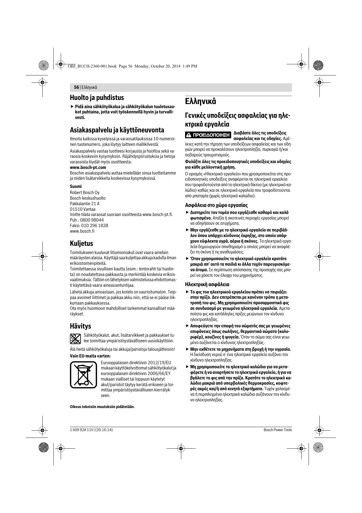Pour toute demande de renseignement ou commande de pièces de rechange, précisez-nous impérativement le numéro d’article à dix chiffres de l’outil électroportatif indiqué sur la plaque signalétique. Notre Service Après-Vente répond à vos questions concernant la réparation et l’entretien de votre produit et les pièces de rechange. Vous trouverez des vues éclatées ainsi que des informations concernant les pièces de rechange également sous : www.bosch-pt.com Les conseillers techniques et assistants Bosch sont à votre disposition pour répondre à vos questions concernant nos produits et leurs accessoires. France Passez votre commande de pièces détachées directement en ligne sur notre site www.bosch-pt.fr. Vous êtes un utilisateur, contactez : Le Service Clientèle Bosch Outillage Electroportatif Tel. : 0811 360122 (coût d’une communication locale) Fax : (01) 49454767 N’expédiez les accus que si le carter n’est pas endommagé. Recouvrez les contacts non protégés et emballez l’accu de manière à ce qu’il ne puisse pas se déplacer dans l’emballage. Veuillez également respecter les règlementations supplémentaires éventuellement en vigueur.