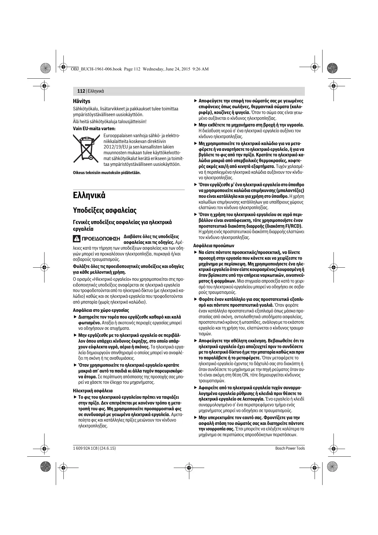Υποδείξεις ασφαλείας Γενικές υποδείξεις ασφαλείας για ηλεκτρικά Διαβάστε όλες τις υποδείξεις ασφαλείας και τις οδηγίες. Αμέλειες κατά την τήρηση των υποδείξεων ασφαλείας και των οδηγιών μπορεί να προκαλέσουν ηλεκτροπληξία, πυρκαγιά ή/και σοβαρούς τραυματισμούς. Φυλάξτε όλες τις προειδοποιητικές υποδείξεις και οδηγίες για κάθε μελλοντική χρήση. Ο ορισμός «Ηλεκτρικό εργαλείο» που χρησιμοποιείται στις προειδοποιητικές υποδείξεις αναφέρεται σε ηλεκτρικά εργαλεία που τροφοδοτούνται από το ηλεκτρικό δίκτυο (με ηλεκτρικό καλώδιο) καθώς και σε ηλεκτρικά εργαλεία που τροφοδοτούνται από μπαταρία (χωρίς ηλεκτρικό καλώδιο). Ασφάλεια στο χώρο εργασίας Διατηρείτε τον τομέα που εργάζεσθε καθαρό και καλά φωτισμένο. Αταξία ή σκοτεινές περιοχές εργασίας μπορεί να οδηγήσουν σε ατυχήματα. Μην εργάζεσθε με το ηλεκτρικό εργαλείο σε περιβάλλον όπου υπάρχει κίνδυνος έκρηξης, στο οποίο υπάρχουν εύφλεκτα υγρά, αέρια ή σκόνες. Τα ηλεκτρικά εργαλεία δημιουργούν σπινθηρισμό ο οποίος μπορεί να αναφλέξει τη σκόνη ή τις αναθυμιάσεις. Όταν χρησιμοποιείτε το ηλεκτρικό εργαλείο κρατάτε μακριά απ’ αυτό τα παιδιά κι άλλα τυχόν παρευρισκόμενα άτομα. Σε περίπτωση απόσπασης της προσοχής σας μπορεί να χάσετε τον έλεγχο του μηχανήματος. Ηλεκτρική ασφάλεια Το φις του ηλεκτρικού εργαλείου πρέπει να ταιριάζει στην πρίζα. Δεν επιτρέπεται με κανέναν τρόπο η μετατροπή του φις. Μη χρησιμοποιείτε προσαρμοστικά φις σε συνδυασμό με γειωμένα ηλεκτρικά εργαλεία. Αμεταποίητα φις και κατάλληλες πρίζες μειώνουν τον κίνδυνο ηλεκτροπληξίας. 1 609 92A 1C8 | (24.6.15) Αποφεύγετε την επαφή του σώματός σας με γειωμένες επιφάνειες όπως σωλήνες, θερμαντικά σώματα (καλοριφέρ), κουζίνες ή ψυγεία. Όταν το σώμα σας είναι γειωμένο αυξάνεται ο κίνδυνος ηλεκτροπληξίας. Μην εκθέτετε τα μηχανήματα στη βροχή ή την υγρασία. Η διείσδυση νερού σ’ ένα ηλεκτρικό εργαλείο αυξάνει τον κίνδυνο ηλεκτροπληξίας. Μη χρησιμοποιείτε το ηλεκτρικό καλώδιο για να μεταφέρετε ή να αναρτήσετε το ηλεκτρικό εργαλείο, ή για να βγάλετε το φις από την πρίζα. Κρατάτε το ηλεκτρικό καλώδιο μακριά από υπερβολικές θερμοκρασίες, κοφτερές ακμές και/ή από κινητά εξαρτήματα. Τυχόν χαλασμένα ή περιπλεγμένα ηλεκτρικά καλώδια αυξάνουν τον κίνδυνο ηλεκτροπληξίας. Όταν εργάζεσθε μ’ ένα ηλεκτρικό εργαλείο στο ύπαιθρο να χρησιμοποιείτε καλώδια επιμήκυνσης (μπαλαντέζες) που είναι κατάλληλα και για χρήση στο ύπαιθρο. Η χρήση καλωδίων επιμήκυνσης κατάλληλων για υπαίθριους χώρους ελαττώνει τον κίνδυνο ηλεκτροπληξίας. Όταν η χρήση του ηλεκτρικού εργαλείου σε υγρό περιβάλλον είναι αναπόφευκτη, τότε χρησιμοποιήστε έναν προστατευτικό διακόπτη διαρροής (διακόπτη FI/RCD). Η χρήση ενός προστατευτικού διακόπτη διαρροής ελαττώνει τον κίνδυνο ηλεκτροπληξίας. Ασφάλεια προσώπων Να είστε πάντοτε προσεκτικός/προσεκτική, να δίνετε προσοχή στην εργασία που κάνετε και να χειρίζεστε το μηχάνημα με περίσκεψη. Μη χρησιμοποιήσετε ένα ηλεκτρικό εργαλείο όταν είστε κουρασμένος/κουρασμένη ή όταν βρίσκεστε υπό την επήρεια ναρκωτικών, οινοπνεύματος ή φαρμάκων. Μια στιγμιαία απροσεξία κατά το χειρισμό του ηλεκτρικού εργαλείου μπορεί να οδηγήσει σε σοβαρούς τραυματισμούς. Φοράτε έναν κατάλληλο για σας προστατευτικό εξοπλισμό και πάντοτε προστατευτικά γυαλιά. Όταν φοράτε έναν κατάλληλο προστατευτικό εξοπλισμό όπως μάσκα προστασίας από σκόνη, αντι