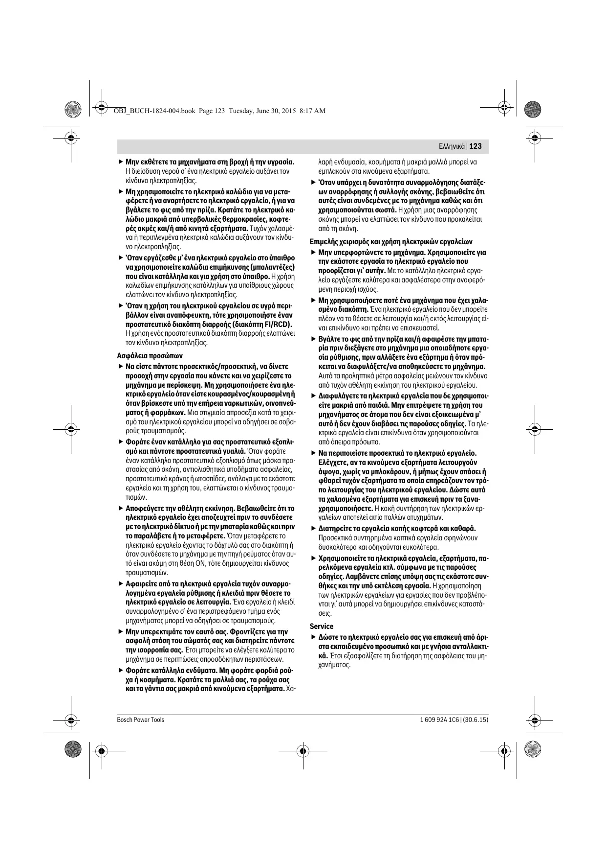 Υποδείξεις ασφαλείας Γενικές υποδείξεις ασφαλείας για ηλεκτρικά εργαλεία Διαβάστε όλες τις υποδείξεις ασφαλείας και τις οδηγίες. Αμέλειες κατά την τήρηση των υποδείξεων ασφαλείας και των οδηγιών μπορεί να προκαλέσουν ηλεκτροπληξία, πυρκαγιά ή/και σοβαρούς τραυματισμούς. Φυλάξτε όλες τις προειδοποιητικές υποδείξεις και οδηγίες για κάθε μελλοντική χρήση. Ο ορισμός «Ηλεκτρικό εργαλείο» που χρησιμοποιείται στις προειδοποιητικές υποδείξεις αναφέρεται σε ηλεκτρικά εργαλεία που τροφοδοτούνται από το ηλεκτρικό δίκτυο (με ηλεκτρικό καλώδιο) καθώς και σε ηλεκτρικά εργαλεία που τροφοδοτούνται από μπαταρία (χωρίς ηλεκτρικό καλώδιο). Ασφάλεια στο χώρο εργασίας Διατηρείτε τον τομέα που εργάζεσθε καθαρό και καλά φωτισμένο. Αταξία ή σκοτεινές περιοχές εργασίας μπορεί να οδηγήσουν σε ατυχήματα. Μην εργάζεσθε με το ηλεκτρικό εργαλείο σε περιβάλλον όπου υπάρχει κίνδυνος έκρηξης, στο οποίο υπάρχουν εύφλεκτα υγρά, αέρια ή σκόνες. Τα ηλεκτρικά εργαλεία δημιουργούν σπινθηρισμό ο οποίος μπορεί να αναφλέξει τη σκόνη ή τις αναθυμιάσεις. Όταν χρησιμοποιείτε το ηλεκτρικό εργαλείο κρατάτε μακριά απ’ αυτό τα παιδιά κι άλλα τυχόν παρευρισκόμενα άτομα. Σε περίπτωση απόσπασης της προσοχής σας μπορεί να χάσετε τον έλεγχο του μηχανήματος. Ηλεκτρική ασφάλεια Το φις του ηλεκτρικού εργαλείου πρέπει να ταιριάζει στην πρίζα. Δεν επιτρέπεται με κανέναν τρόπο η μετατροπή του φις. Μη χρησιμοποιείτε προσαρμοστικά φις σε συνδυασμό με γειωμένα ηλεκτρικά εργαλεία. Αμεταποίητα φις και κατάλληλες πρίζες μειώνουν τον κίνδυνο ηλεκτροπληξίας. Αποφεύγετε την επαφή του σώματός σας με γειωμένες επιφάνειες όπως σωλήνες, θερμαντικά σώματα (καλοριφέρ), κουζίνες ή ψυγεία. Όταν το σώμα σας είναι γειωμένο αυξάνεται ο κίνδυνος ηλεκτροπληξίας. Bosch Power Tools OBJ_BUCH-1824-004.book Page 123 Tuesday, June 30, 2015 8:17 AM Ελληνικά | 123 Μην εκθέτετε τα μηχανήματα στη βροχή ή την υγρασία. Η διείσδυση νερού σ’ ένα ηλεκτρικό εργαλείο αυξάνει τον κίνδυνο ηλεκτροπληξίας. Μη χρησιμοποιείτε το ηλεκτρικό καλώδιο για να μεταφέρετε ή να αναρτήσετε το ηλεκτρικό εργαλείο, ή για να βγάλετε το φις από την πρίζα. Κρατάτε το ηλεκτρικό καλώδιο μακριά από υπερβολικές θερμοκρασίες, κοφτερές ακμές και/ή από κινητά εξαρτήματα. Τυχόν χαλασμένα ή περιπλεγμένα ηλεκτρικά καλώδια αυξάνουν τον κίνδυνο ηλεκτροπληξίας. Όταν εργάζεσθε μ’ ένα ηλεκτρικό εργαλείο στο ύπαιθρο να χρησιμοποιείτε καλώδια επιμήκυνσης (μπαλαντέζες) που είναι κατάλληλα και για χρήση στο ύπαιθρο. Η χρήση καλωδίων επιμήκυνσης κατάλληλων για υπαίθριους χώρους ελαττώνει τον κίνδυνο ηλεκτροπληξίας. Όταν η χρήση του ηλεκτρικού εργαλείου σε υγρό περιβάλλον είναι αναπόφευκτη, τότε χρησιμοποιήστε έναν προστατευτικό διακόπτη διαρροής (διακόπτη FI/RCD). Η χρήση ενός προστατευτικού διακόπτη διαρροής ελαττώνει τον κίνδυνο ηλεκτροπληξίας. Ασφάλεια προσώπων Να είστε πάντοτε προσεκτικός/προσεκτική, να δίνετε προσοχή στην εργασία που κάνετε και να χειρίζεστε το μηχάνημα με περίσκεψη. Μη χρησιμοποιήσετε ένα ηλεκτρικό εργαλείο όταν είστε κουρασμένος/κουρασμένη ή όταν βρίσκεστε υπό την επήρεια ναρκωτικών, οινοπνεύματος ή φαρμάκων. Μια στιγμιαία απροσεξία κατά το χειρισμό του ηλεκτρικού εργαλείου μπορεί να οδηγήσει σε σοβαρούς τραυματισμούς. Φοράτε έναν κατάλληλο για σας προστατευτικό εξοπλισμό και πάντοτε προστατευτικά γυαλιά. Όταν φοράτε έναν κατάλληλο προστατευτ