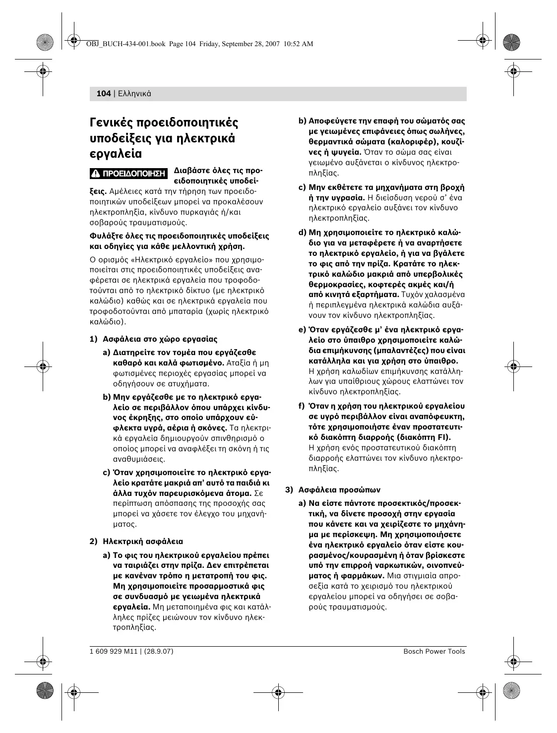Διαβάστε όλες τις προειδοποιητικές υποδείξεις. Αμέλειες κατά την τήρηση των προειδοποιητικών υποδείξεων μπορεί να προκαλέσουν ηλεκτροπληξία, κίνδυνο πυρκαγιάς ή/και σοβαρούς τραυματισμούς. Φυλάξτε όλες τις προειδοποιητικές υποδείξεις και οδηγίες για κάθε μελλοντική χρήση. Ο ορισμός «Ηλεκτρικό εργαλείο» που χρησιμοποιείται στις προειδοποιητικές υποδείξεις αναφέρεται σε ηλεκτρικά εργαλεία που τροφοδοτούνται από το ηλεκτρικό δίκτυο (με ηλεκτρικό καλώδιο) καθώς και σε ηλεκτρικά εργαλεία που τροφοδοτούνται από μπαταρία (χωρίς ηλεκτρικό καλώδιο). 1) Ασφάλεια στο χώρο εργασίας a) Διατηρείτε τον τομέα που εργάζεσθε καθαρό και καλά φωτισμένο. Αταξία ή μη φωτισμένες περιοχές εργασίας μπορεί να οδηγήσουν σε ατυχήματα. b) Μην εργάζεσθε με το ηλεκτρικό εργαλείο σε περιβάλλον όπου υπάρχει κίνδυνος έκρηξης, στο οποίο υπάρχουν εύφλεκτα υγρά, αέρια ή σκόνες. Τα ηλεκτρικά εργαλεία δημιουργούν σπινθηρισμό ο οποίος μπορεί να αναφλέξει τη σκόνη ή τις αναθυμιάσεις. c) Όταν χρησιμοποιείτε το ηλεκτρικό εργαλείο κρατάτε μακριά απ’ αυτό τα παιδιά κι άλλα τυχόν παρευρισκόμενα άτομα. Σε περίπτωση απόσπασης της προσοχής σας μπορεί να χάσετε τον έλεγχο του μηχανήματος. 2) Ηλεκτρική ασφάλεια a) Το φις του ηλεκτρικού εργαλείου πρέπει να ταιριάζει στην πρίζα. Δεν επιτρέπεται με κανέναν τρόπο η μετατροπή του φις. Μη χρησιμοποιείτε προσαρμοστικά φις σε συνδυασμό με γειωμένα ηλεκτρικά εργαλεία. Μη μεταποιημένα φις και κατάλληλες πρίζες μειώνουν τον κίνδυνο ηλεκτροπληξίας. 1 609 929 M11 | (28.9.07)