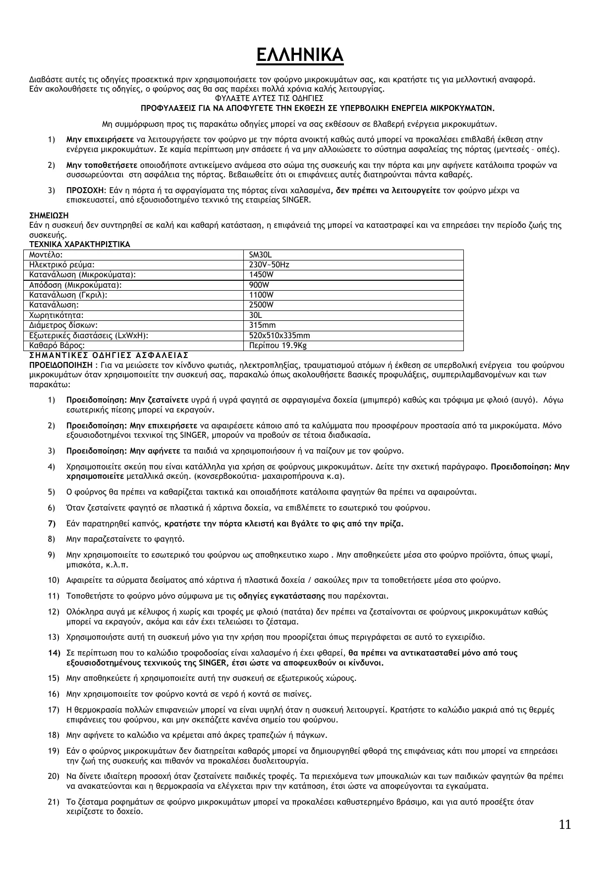 Εάν η συσκευή δεν συντηρηθεί σε καλή και καθαρή κατάσταση, η επιφάνειά της μπορεί να καταστραφεί και να επηρεάσει την περίοδο ζωής της ΤΕΧΝΙΚΑ ΧΑΡΑΚΤΗΡΙΣΤΙΚA SM30L Ηλεκτρικό ρεύμα: 230V~50Hz Κατανάλωση (Μικροκύματα): 1450W Απόδοση (Μικροκύματα): 900W Κατανάλωση (Γκριλ): 1100W Κατανάλωση: 2500W Χωρητικότητα: 30L Διάμετρος δίσκων: 315mm Εξωτερικές διαστάσεις (LxWxH): 520x510x335mm Καθαρό Βάρος: Περίπου 19.9Kg ΣΗΜΑΝΤΙΚΕΣ ΟΔΗΓΙΕΣ ΑΣΦΑΛΕΙΑΣ ΠΡΟΕΙΔΟΠΟΙΗΣΗ : Για να μειώσετε τον κίνδυνο φωτιάς, ηλεκτροπληξίας, τραυματισμού ατόμων ή έκθεση σε υπερβολική ενέργεια του φούρνου μικροκυμάτων όταν χρησιμοποιείτε την συσκευή σας, παρακαλώ όπως ακολουθήσετε βασικές προφυλάξεις, συμπεριλαμβανομένων και των