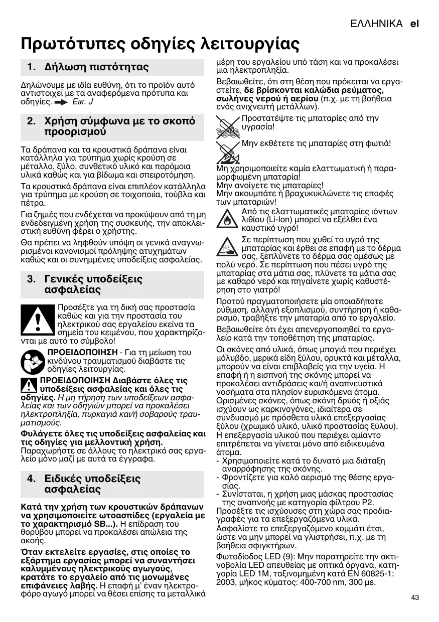 3. Γενικές υποδείξεις ασφαλείας Προσέξτε για τη δική σας προστασία καθώς και για την προστασία του ηλεκτρικού σας εργαλείου εκείνα τα σημεία του κειμένου, που χαρακτηρίζονται με αυτό το σύμβολο! ΠΡΟΕΙΔΟΠΟΙΗΣΗ - Για τη μείωση του κινδύνου τραυματισμού διαβάστε τις οδηγίες λειτουργίας. ΠΡΟΕΙΔΟΠΟΙΗΣΗ Διαβάστε όλες τις υποδείξεις ασφαλείας και όλες τις οδηγίες. Η μη τήρηση των υποδείξεων ασφαλείας και των οδηγιών μπορεί να προκαλέσει ηλεκτροπληξία, πυρκαγιά και/ή σοβαρούς τραυματισμούς. Φυλάγετε όλες τις υποδείξεις ασφαλείας και τις οδηγίες για μελλοντική χρήση. Παραχωρήστε σε άλλους το ηλεκτρικό σας εργαλείο μόνο μαζί με αυτά τα έγγραφα.