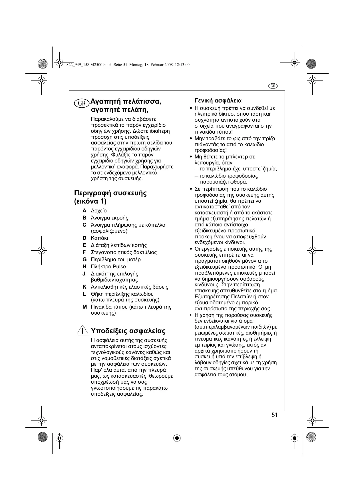 rΑγαπητή αγαπητέ πελάτη, Παρακαλούµε να διαβάσετε προσεκτικά το παρόν εγχειρίδιο οδηγιών χρήσης. ∆ώστε ιδιαίτερη προσοχή στις υποδείξεις ασφαλείας στην πρώτη σελίδα του παρόντος εγχειριδίου οδηγιών χρήσης! Φυλάξτε το παρόν εγχειρίδιο οδηγιών χρήσης για µελλοντική αναφορά. Παραχωρήστε το σε ενδεχόµενο µελλοντικό χρήστη της συσκευής. Περιγραφή συσκευής (εικόνα 1) A ∆οχείο B Άνοιγµα εκροής C Άνοιγµα πλήρωσης µε κύπελλο (ασφαλιζόµενο) D Καπάκι E ∆ιάταξη λεπίδων κοπής F Στεγανοποιητικός δακτύλιος G Περίβληµα του µοτέρ H Πλήκτρο Pulse J ∆ιακόπτης επιλογής βαθµίδωνταχύτητας K Αντιολισθητικές ελαστικές βάσεις L Θήκη περιέλιξης καλωδίου (κάτω πλευρά της συσκευής) M Πινακίδα τύπου (κάτω πλευρά της