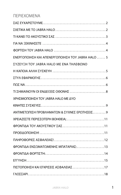 Φόρτιση του Jabra HALO . . . . . . . . . . . . . . . . . . . . . . . . . . . . . . . . . . . . . 4 Ενεργοποίηση και απενεργοποίηση του Jabra HALO . . . . . . . 5 Σύζευξη του Jabra HALO με ένα τηλέφωνο ή κάποια άλλη συσκευή . . . . . . . . . . . . . . . . . . . . . . . . . . . . . . . . . . . . . . 5 Στυλ εφαρμογής . . . . . . . . . . . . . . . . . . . . . . . . . . . . . . . . . . . . . . . . . . . . . 6 Πως να . . . . . . . . . . . . . . . . . . . . . . . . . . . . . . . . . . . . . . . . . . . . . . . . . . . . . . . . 6 Τι σημαίνουν οι ενδείξεις οθόνης . . . . . . . . . . . . . . . . . . . . . . . . . . 8 Χρησιμοποίηση του Jabra HALO με δύο κινητές συσκευές . . . . . . . . . . . . . . . . . . . . . . . . . . . . . . . . . . . . . . . . . . . . . 9 Αντιμετώπιση προβλημάτων & Συχνές ερωτήσεις . . . . . . . . . 9 ΧΡΕΙΑΖΕΣΤΕ ΠΕΡΙΣΣΟΤΕΡΗ ΒΟΗΘΕΙΑ; . . . . . . . . . . . . . . . . . . . . . . . . . . 11 ΦΡΟΝΤΙΔΑ ΤΟΥ ΑΚΟΥΣΤΙΚΟΥ ΣΑΣ . . . . . . . . . . . . . . . . . . . . . . . . . . . . 11 ΠΡΟΕΙΔΟΠΟΙΗΣΗ! . . . . . . . . . . . . . . . . . . . . . . . . . . . . . . . . . . . . . . . . . . . . . 11 ΠΛΗΡΟΦΟΡΙΕΣ ΑΣΦΑΛΕΙΑΣ! . . . . . . . . . . . . . . . . . . . . . . . . . . . . . . . . . . 12 ΦΡΟΝΤΙΔΑ ΕΝΣΩΜΑΤΩΜΕΝΗΣ ΜΠΑΤΑΡΙΑΣ: . . . . . . . . . . . . . . . . . . 13 ΦΡΟΝΤΙΔΑ ΦΟΡΤΙΣΤΗ: . . . . . . . . . . . . . . . . . . . . . . . . . . . . . . . . . . . . . . . . 14 Εγγύηση . . . . . . . . . . . . . . . . . . . . . . . . . . . . . . . . . . . . . . . . . . . . . . . . . . . . . 15 ΠΙΣΤΟΠΟΙΗΣΗ ΚΑΙ ΕΓΚΡΙΣΕΙΣ ΑΣΦΑΛΕΙΑΣ . . . . . . . . . . . . . . . . . . . . . 17 ΓΛΩΣΣΑΡΙ . . . . . . . . . . . . . . . . . . . . . . . . . . . . . . . . . . . . . . . . . . . . . . . . . . . . 18