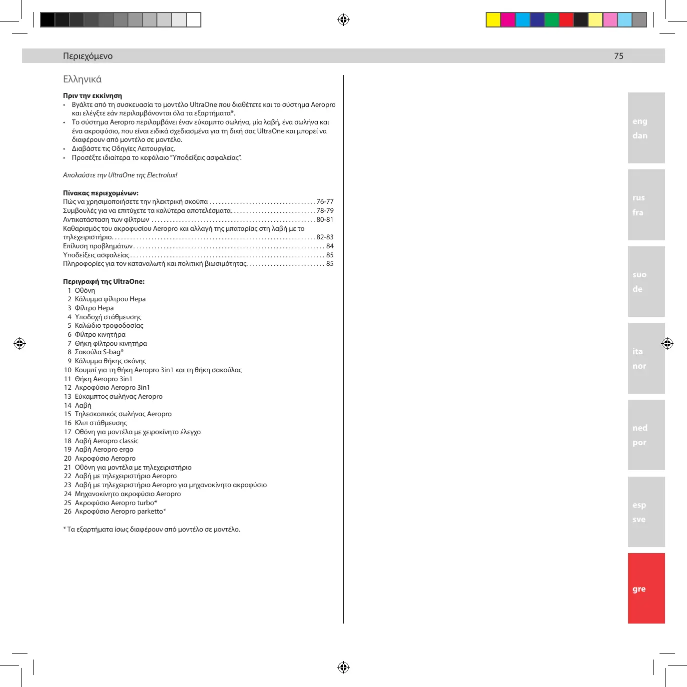 - Προσέξτε ιδιαίτερα το κεφάλαιο “Υποδείξεις ασφαλείας”. eng dan Απολαύστε την UltraOne της Electrolux! Πίνακας περιεχομένων: Πώς να χρησιμοποιήσετε την ηλεκτρική σκούπα. . . . . . . . . . . . . . . . . . . . . . . . . . . . . . . . . . . . 76-77 Συμβουλές για να επιτύχετε τα καλύτερα αποτελέσματα. . . . . . . . . . . . . . . . . . . . . . . . . . . . . 78-79 Αντικατάσταση των φίλτρων . . . . . . . . . . . . . . . . . . . . . . . . . . . . . . . . . . . . . . . . . . . . . . . . . . . . . . . 80-81 Καθαρισμός του ακροφυσίου Aeropro και αλλαγή της μπαταρίας στη λαβή με το τηλεχειριστήριο. . . . . . . . . . . . . . . . . . . . . . . . . . . . . . . . . . . . . . . . . . . . . . . . . . . . . . . . . . . . . . . . . . . . 82-83 Επίλυση προβλημάτων. . . . . . . . . . . . . . . . . . . . . . . . . . . . . . . . . . . . . . . . . . . . . . . . . . . . . . . . . . . . . . . . 84 Υποδείξεις ασφαλείας. . . . . . . . . . . . . . . . . . . . . . . . . . . . . . . . . . . . . . . . . . . . . . . . . . . . . . . . . . . . . . . . . 85 Πληροφορίες για τον καταναλωτή και πολιτική βιωσιμότητας. . . . . . . . . . . . . . . . . . . . . . . . . . 85 Περιγραφή της UltraOne: 1 Οθόνη 2 Κάλυμμα φίλτρου Hepa 3 Φίλτρο Hepa 4 Υποδοχή στάθμευσης 5 Καλώδιο τροφοδοσίας 6 Φίλτρο κινητήρα 7 Θήκη φίλτρου κινητήρα 8 Σακούλα S-bag® 9 Κάλυμμα θήκης σκόνης 10 Κουμπί για τη θήκη Aeropro 3in1 και τη θήκη σακούλας 11 Θήκη Aeropro 3in1 12 Ακροφύσιο Aeropro 3in1 13 Εύκαμπτος σωλήνας Aeropro 14 Λαβή 15 Τηλεσκοπικός σωλήνας Aeropro 16 Κλιπ στάθμευσης 17 Οθόνη για μοντέλα με χειροκίνητο έλεγχο 18 Λαβή Aeropro classic 19 Λαβή Aeropro ergo 20 Ακροφύσιο Aeropro 21 Οθόνη για μοντέλα με τηλεχειριστήριο 22 Λαβή με τηλεχειριστήριο Aeropro 23 Λαβή με τηλεχειριστήριο Aeropro για μηχανοκίνητο ακροφύσιο 24 Μηχανοκίνητο ακροφύσιο Aeropro 25 Ακροφύσιο Aeropro turbo* 26 Ακροφύσιο Aeropro parketto* rus fra suo