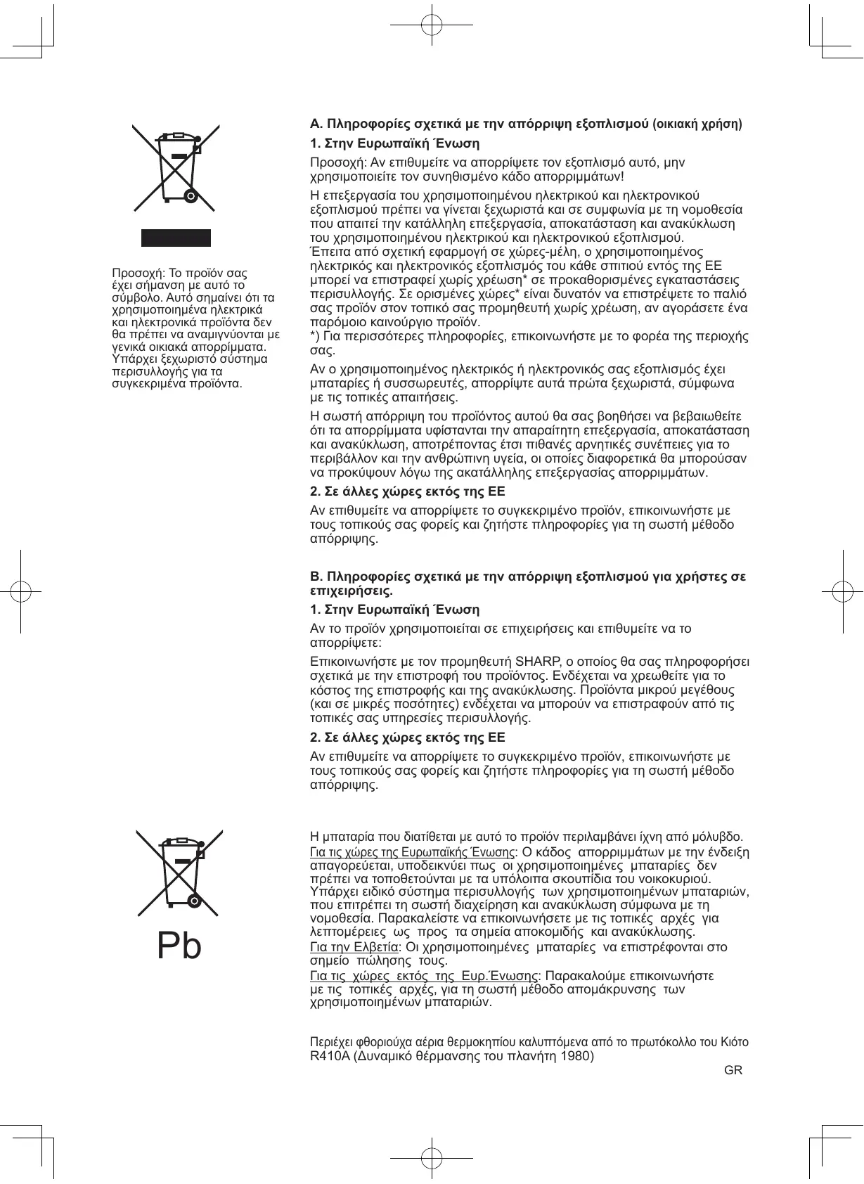 A. Πληροφορίες σχετικά με την απόρριψη εξοπλισμού (οικιακή χρήση) 1. Στην Ευρωπαϊκή Ένωση Προσοχή: Αν επιθυμείτε να απορρίψετε τον εξοπλισμό αυτό, μην χρησιμοποιείτε τον συνηθισμένο κάδο απορριμμάτων! Η επεξεργασία του χρησιμοποιημένου ηλεκτρικού και ηλεκτρονικού εξοπλισμού πρέπει να γίνεται ξεχωριστά και σε συμφωνία με τη νομοθεσία που απαιτεί την κατάλληλη επεξεργασία, αποκατάσταση και ανακύκλωση του χρησιμοποιημένου ηλεκτρικού και ηλεκτρονικού εξοπλισμού. Έπειτα από σχετική εφαρμογή σε χώρες-μέλη, ο χρησιμοποιημένος ηλεκτρικός και ηλεκτρονικός εξοπλισμός του κάθε σπιτιού εντός της ΕΕ μπορεί να επιστραφεί χωρίς χρέωση* σε προκαθορισμένες εγκαταστάσεις περισυλλογής. Σε ορισμένες χώρες* είναι δυνατόν να επιστρέψετε το παλιό σας προϊόν στον τοπικό σας προμηθευτή χωρίς χρέωση, αν αγοράσετε ένα παρόμοιο καινούργιο προϊόν. *) Για περισσότερες πληροφορίες, επικοινωνήστε με το φορέα της περιοχής σας. Αν ο χρησιμοποιημένος ηλεκτρικός ή ηλεκτρονικός σας εξοπλισμός έχει μπαταρίες ή συσσωρευτές, απορρίψτε αυτά πρώτα ξεχωριστά, σύμφωνα με τις τοπικές απαιτήσεις. Η σωστή απόρριψη του προϊόντος αυτού θα σας βοηθήσει να βεβαιωθείτε ότι τα απορρίμματα υφίστανται την απαραίτητη επεξεργασία, αποκατάσταση και ανακύκλωση, αποτρέποντας έτσι πιθανές αρνητικές συνέπειες για το περιβάλλον και την ανθρώπινη υγεία, οι οποίες διαφορετικά θα μπορούσαν να προκύψουν λόγω της ακατάλληλης επεξεργασίας απορριμμάτων. 2. Σε άλλες χώρες εκτός της ΕΕ Αν επιθυμείτε να απορρίψετε το συγκεκριμένο προϊόν, επικοινωνήστε με τους τοπικούς σας φορείς και ζητήστε πληροφορίες για τη σωστή μέθοδο απόρριψης. B. Πληροφορίες σχετικά με την απόρριψη εξοπλισμού για χρήστες σε επιχειρήσεις. 1. Στην Ευρωπαϊκή Ένωση Αν το προϊόν χρησιμοποιείται σε επιχειρήσεις και επιθυμείτε να το απορρίψετε: Επικοινωνήστε με τον προμηθευτή SHARP, ο οποίος θα σας πληροφορήσει σχετικά με την επιστροφή του προϊόντος. Ενδέχεται να χρεωθείτε για το κόστος της επιστροφής και της ανακύκλωσης. Προϊόντα μικρού μεγέθους (και σε μικρές ποσότητες) ενδέχεται να μπορούν να επιστραφούν από τις τοπικές σας υπηρεσίες περισυλλογής. 2. Σε άλλες χώρες εκτός της ΕΕ Αν επιθυμείτε να απορρίψετε το συγκεκριμένο προϊόν, επικοινωνήστε με τους τοπικούς σας φορείς και ζητήστε πληροφορίες για τη σωστή μέθοδο απόρριψης.