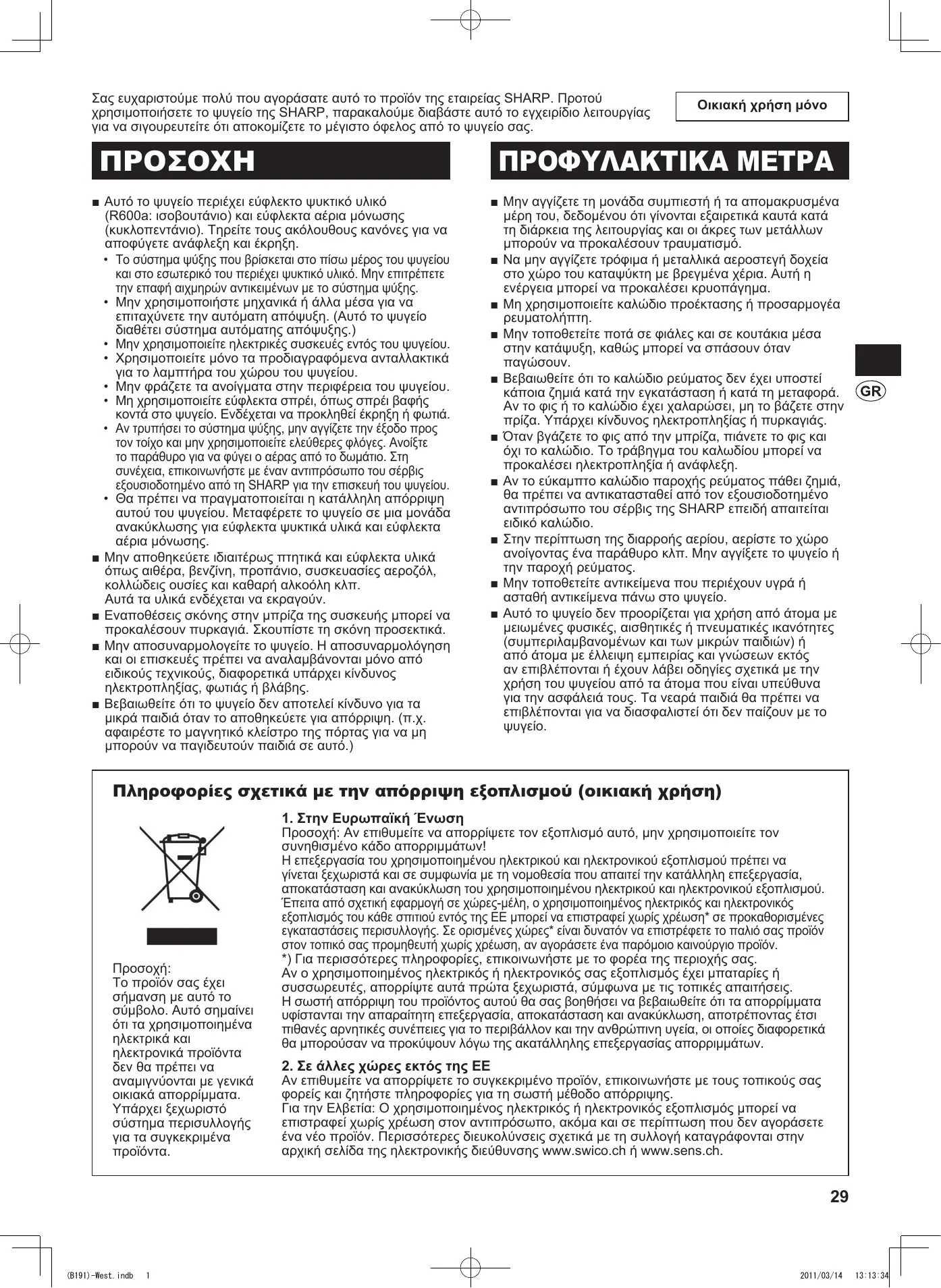 • La comida debe ser fresca. • Congele la comida en porciones pequeñas para congelarla más rápido. Los alimentos en el compartimiento • ¿El frigorífico ha estado trabajando por mucho tiempo con el control de temp. del frigorífico se congelan. establecido en MAX? • Una temperatura ambiente baja puede hacer que la comida se congele aunque tenga el control de temperatura del frigorífico ajustado a MIN. Existen olores en el compartimiento. • Se deben envolver los alimentos con olores fuertes. • La unidad de desodorización no puede eliminar todos los olores. La alarma de la puerta no se • Si no se suspende la alarma de la puerta después de cerrarla, es un defecto. Póngase suspende. en contacto con el centro de servicio de Sharp para solucionar el problema. Método para suspender la alarma de la puerta temporalmente . Ajuste al mismo tiempo los botones para el control de temp. de acuerdo a los pasos siguientes. 3 3 • Le système de réfrigération à l’arrière et à l’intérieur de l’appareil renferme un produit réfrigérant. Veillez à ce qu’aucun objet pointu n’entre en contact avec le système de réfrigération. • Ne pas utiliser d'appareils mécaniques ou d'autre moyen pour accélérer le processus de dégivrage. (Ce réfrigérateur dispose d'un systéme de dégivrage automatique.) • N’utilisez pas d’appareils électriques à l’intérieur du réfrigérateur. • Utiliser uniquement les pièces destinées à la lampe du compartiment du réfrigérateur. • Ne bloquez pas les ouvertures autour du réfrigérateur. • N’utilisez pas de sprays inflammables tels que des bombes de peinture près du réfrigérateur. Ceci peut causer une explosion ou un incendie. • Si le système de réfrigération devait être percé, ne touchez pas la prise murale et n’exposez pas le réfrigérateur à des flammes nues. Ouvrez la fenêtre et aérez la pièce. Puis sollicitez le dépannage auprès d’un agent de service agréé SHARP. • Ce réfrigérateur doit être mis au rebut correctement. Apportez ce réfrigérateur dans un centre de recyclage pour produits réfrigérants inflammables et gaz soufflants isolants. ■ Ne rangez pas de matériaux hautement volatiles et inflammables, comme de l’éther, de l’essence, du gaz propane, des bombes aérosols, des agents adhésifs et de l’alcool pur, etc. Ces matériaux sont susceptibles d’exploser. ■ Ne pas laisser s'accumuler la poussière sur la prise électrique. Ceci peut être à l'origine d'incendie. L’essuyer soigneusement. ■ N'effectuez aucune modification vous-même sur le réfrigérateur. Ceci peut être la cause d’électrocutions, incendies ou blessures. Seuls des techniciens de réparation qualifiés sont habilités à démonter ou réparer le réfrigérateur. ■ Assurez-vous que le réfrigérateur stocké pour être mis au rebut ne présente pas un danger pour les enfants. (Par exemple enlevez le joint de porte magnétique pour empêcher les enfants ne se piègent avec.)