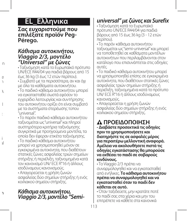 • Διαβάστε προσεκτικά τις οδηγίες πριν το χρησιμοποιήσετε και διατηρήστε τις σε ασφαλές μέρος για περαιτέρω μελλοντική αναφορά. Αμέλεια να ακολουθήσετε πιστά τις οδηγίες εγκατάστασης θα μπορούσε να εκθέσει το παιδί σε σοβαρούς κινδύνους. • Το Viaggio 2/3 πρέπει να συναρμολογηθεί και να εγκατασταθεί από ενήλικες. Το κάθισμα αυτοκινήτου πρέπει να συναρμολογηθεί και να εγκατασταθεί όταν το παιδί δεν κάθεται σε αυτό. • Όταν ταξιδεύετε, μην κρατάτε ποτέ το παιδί σας στα χέρια και μην του επιτρέπετε να κάθετε στα κανονικά 113
