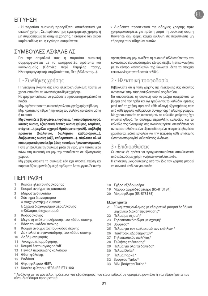 γνώση ως προς τη χρήση, εκτός εάν τα άτομα αυτά βρίσκονται υπό επίβλεψη ή ακολουθούν πρότερες οδηγίες που αφορούν στη χρήση της συσκευής από κάποιο άτομο που είναι υπεύθυνο ως προς την ασφάλειά τους. Τα παιδιά πρέπει να βρίσκονται υπό επίβλεψη προκειμένου να διασφαλιστεί ότι δεν θα χρησιμοποιήσουν τη συσκευή ως παιχνίδι. Η ηλεκτρική σας σκούπα διαθέτει μια ασφάλεια που αποτρέπει την υπερθέρμανση του κινητήρα. Σε ορισμένες περιπτώσεις (χρήση του πέλματος σε πολυθρόνες, καθίσματα…) η ασφάλεια απενεργοποιείται και η συσκευή μπορεί να εκπέμψει έναν ασυνήθιστο θόρυβο άνευ σημασίας. Να χρησιμοποιείτε αποκλειστικά και μόνο γνήσια εξαρτήματα και φίλτρα της Rowenta. Βεβαιωθείτε ότι όλα τα φίλτρα είναι σωστά τοποθετημένα στη θέση τους. Ποτέ μη χρησιμοποιείτε την ηλεκτρική σκούπα χωρίς σύστημα φιλτραρίσματος (αφρώδες φίλτρο, μικροφίλτρο και φίλτρο). Μην επανατοποθετείτε ποτέ το αφρώδες φίλτρο και το μικροφίλτρο μέσα στη συσκευή εάν πρώτα δεν έχουν στεγνώσει εντελώς. Σε περίπτωση που συναντήσετε δυσκολίες ως προς την αγορά εξαρτημάτων και φίλτρων για την παρούσα ηλεκτρική σκούπα, επικοινωνήστε με το κέντρο καταναλωτών της Rowenta (δείτε τα στοιχεία επικοινωνίας στην τελευταία σελίδα).