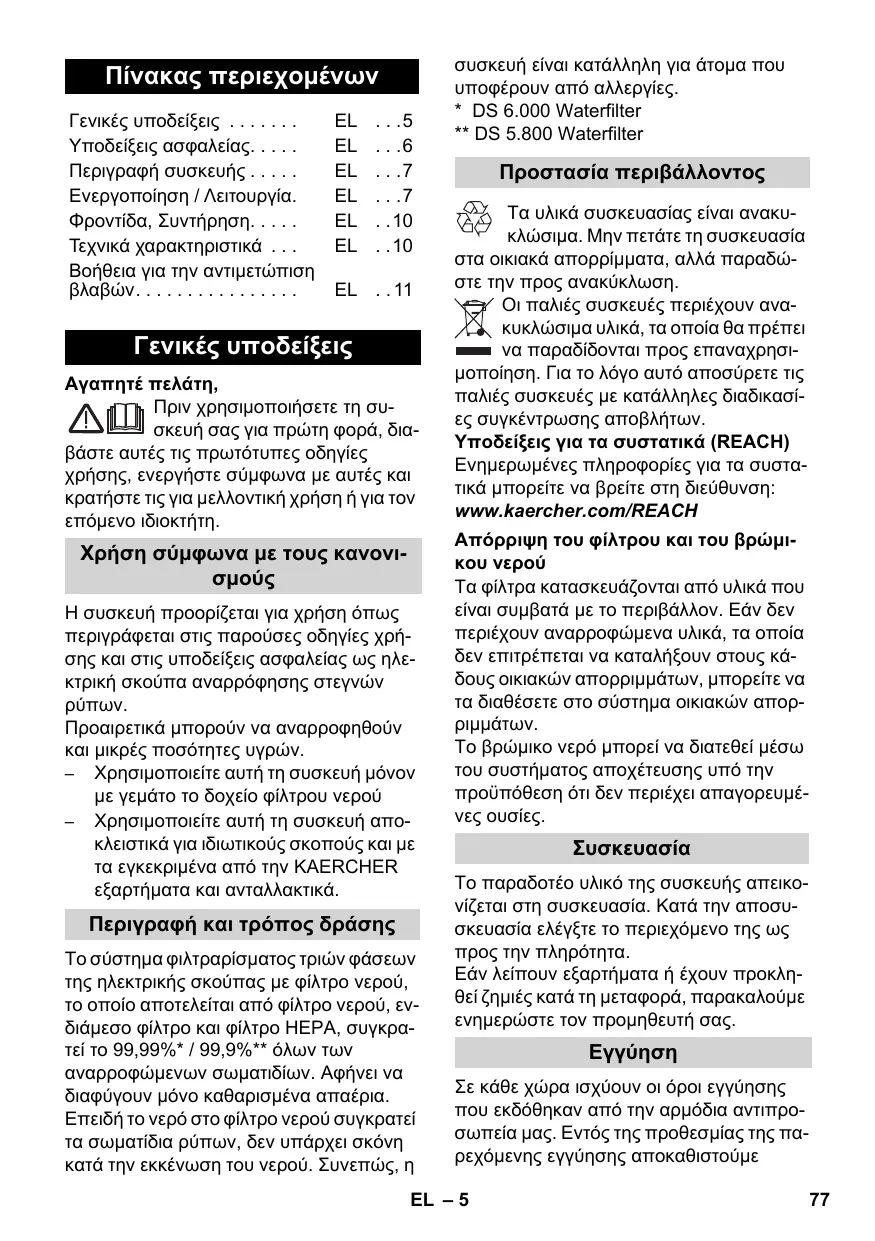 Χρήση σύμφωνα με τους κανονισμούς Η συσκευή προορίζεται για χρήση όπως περιγράφεται στις παρούσες οδηγίες χρήσης και στις υποδείξεις ασφαλείας ως ηλεκτρική σκούπα αναρρόφησης στεγνών ρύπων. Προαιρετικά μπορούν να αναρροφηθούν και μικρές ποσότητες υγρών. – Χρησιμοποιείτε αυτή τη συσκευή μόνον με γεμάτο το δοχείο φίλτρου νερού – Χρησιμοποιείτε αυτή τη συσκευή αποκλειστικά για ιδιωτικούς σκοπούς και με τα εγκεκριμένα από την KAERCHER εξαρτήματα και ανταλλακτικά.