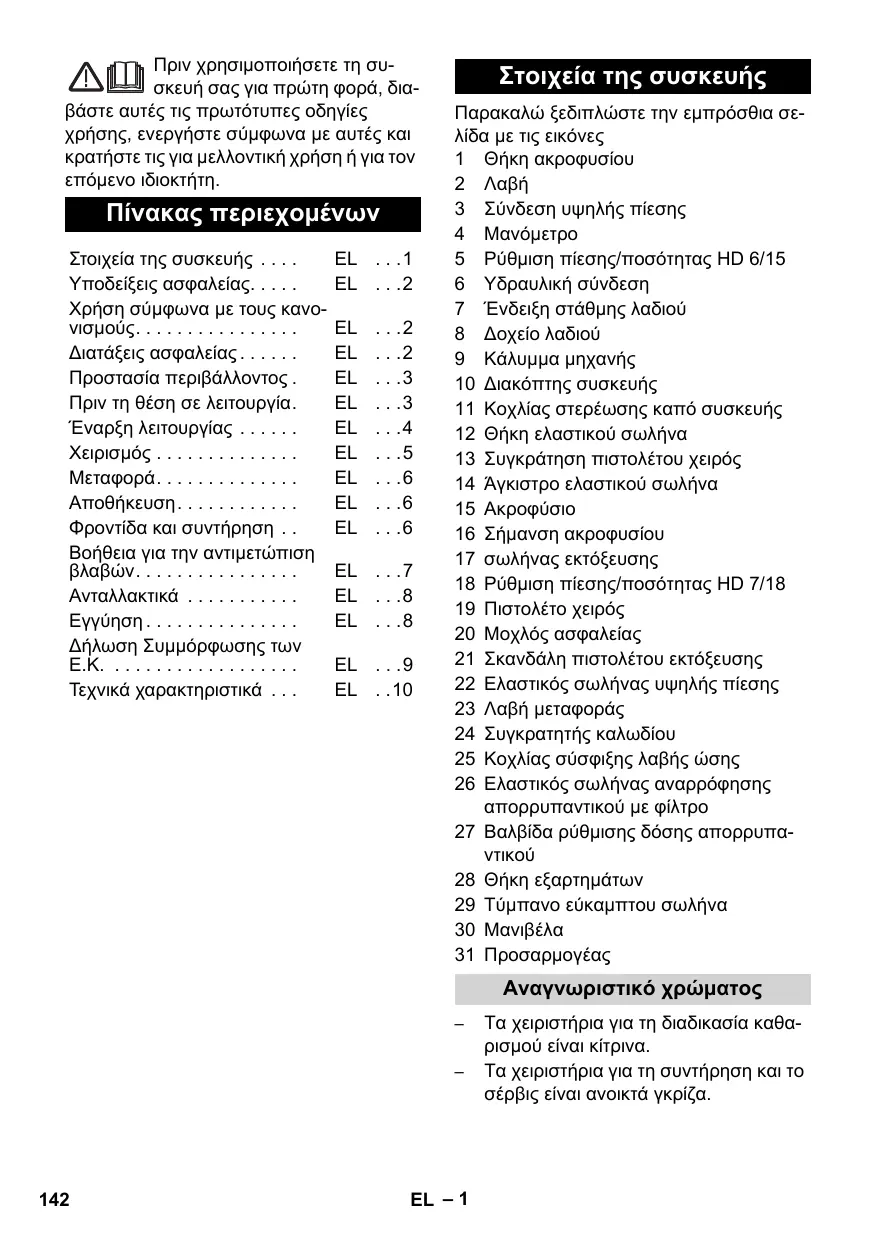 - EL Στοιχεία της συσκευής Παρακαλώ ξεδιπλώστε την εμπρόσθια σελίδα με τις εικόνες 1 Θήκη ακροφυσίου 2 Λαβή 3 Σύνδεση υψηλής πίεσης 4 Μανόμετρο 5 Ρύθμιση πίεσης/ποσότητας HD 6/15 6 Υδραυλική σύνδεση 7 Ένδειξη στάθμης λαδιού 8 Δοχείο λαδιού 9 Κάλυμμα μηχανής 10 Διακόπτης συσκευής 11 Κοχλίας στερέωσης καπό συσκευής 12 Θήκη ελαστικού σωλήνα 13 Συγκράτηση πιστολέτου χειρός 14 Άγκιστρο ελαστικού σωλήνα 15 Ακροφύσιο 16 Σήμανση ακροφυσίου 17 σωλήνας εκτόξευσης 18 Ρύθμιση πίεσης/ποσότητας HD 7/18 19 Πιστολέτο χειρός 20 Μοχλός ασφαλείας 21 Σκανδάλη πιστολέτου εκτόξευσης 22 Ελαστικός σωλήνας υψηλής πίεσης 23 Λαβή μεταφοράς 24 Συγκρατητής καλωδίου 25 Κοχλίας σύσφιξης λαβής ώσης 26 Ελαστικός σωλήνας αναρρόφησης απορρυπαντικού με φίλτρο 27 Βαλβίδα ρύθμισης δόσης απορρυπαντικού 28 Θήκη εξαρτημάτων 29 Τύμπανο εύκαμπτου σωλήνα 30 Μανιβέλα 31 Προσαρμογέας Αναγνωριστικό χρώματος p. 10