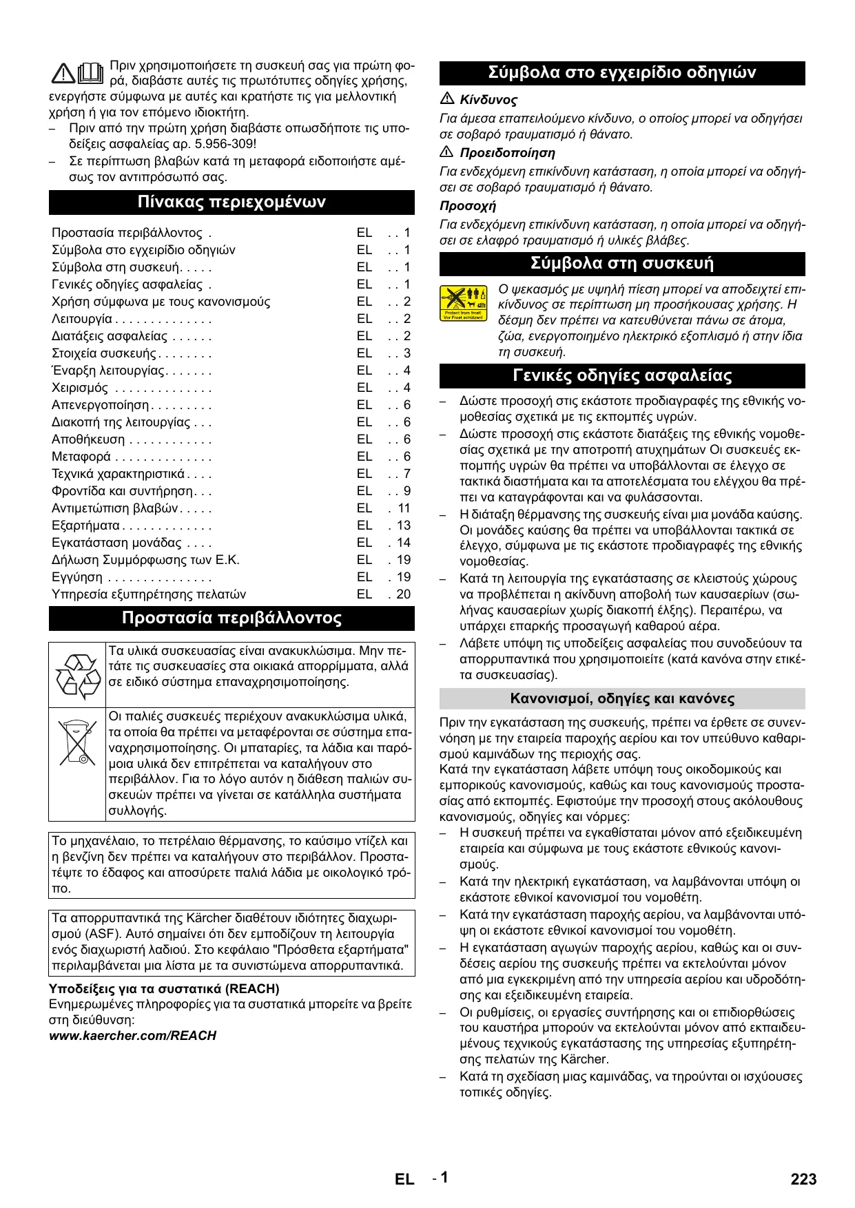 Δώστε προσοχή στις εκάστοτε προδιαγραφές της εθνικής νομοθεσίας σχετικά με τις εκπομπές υγρών. Δώστε προσοχή στις εκάστοτε διατάξεις της εθνικής νομοθεσίας σχετικά με την αποτροπή ατυχημάτων Οι συσκευές εκπομπής υγρών θα πρέπει να υποβάλλονται σε έλεγχο σε τακτικά διαστήματα και τα αποτελέσματα του ελέγχου θα πρέπει να καταγράφονται και να φυλάσσονται. Η διάταξη θέρμανσης της συσκευής είναι μια μονάδα καύσης. Οι μονάδες καύσης θα πρέπει να υποβάλλονται τακτικά σε έλεγχο, σύμφωνα με τις εκάστοτε προδιαγραφές της εθνικής νομοθεσίας. Κατά τη λειτουργία της εγκατάστασης σε κλειστούς χώρους να προβλέπεται η ακίνδυνη αποβολή των καυσαερίων (σωλήνας καυσαερίων χωρίς διακοπή έλξης). Περαιτέρω, να υπάρχει επαρκής προσαγωγή καθαρού αέρα. Λάβετε υπόψη τις υποδείξεις ασφαλείας που συνοδεύουν τα απορρυπαντικά που χρησιμοποιείτε (κατά κανόνα στην ετικέτα συσκευασίας). Κανονισμοί, οδηγίες και κανόνες Οι παλιές συσκευές περιέχουν ανακυκλώσιμα υλικά, τα οποία θα πρέπει να μεταφέρονται σε σύστημα επαναχρησιμοποίησης. Οι μπαταρίες, τα λάδια και παρόμοια υλικά δεν επιτρέπεται να καταλήγουν στο περιβάλλον. Για το λόγο αυτόν η διάθεση παλιών συσκευών πρέπει να γίνεται σε κατάλληλα συστήματα Το μηχανέλαιο, το πετρέλαιο θέρμανσης, το καύσιμο ντίζελ και η βενζίνη δεν πρέπει να καταλήγουν στο περιβάλλον. Προστατέψτε το έδαφος και αποσύρετε παλιά λάδια με οικολογικό τρόπο. Τα απορρυπαντικά της Kärcher διαθέτουν ιδιότητες διαχωρισμού (ASF). Αυτό σημαίνει ότι δεν εμποδίζουν τη λειτουργία ενός διαχωριστή λαδιού. Στο κεφάλαιο "Πρόσθετα εξαρτήματα" περιλαμβάνεται μια λίστα με τα συνιστώμενα απορρυπαντικά. Υποδείξεις για τα συστατικά (REACH) Ενημερωμένες πληροφορίες για τα συστατικά μπορείτε να βρείτε στη διεύθυνση: www.kaercher.com/REACH
