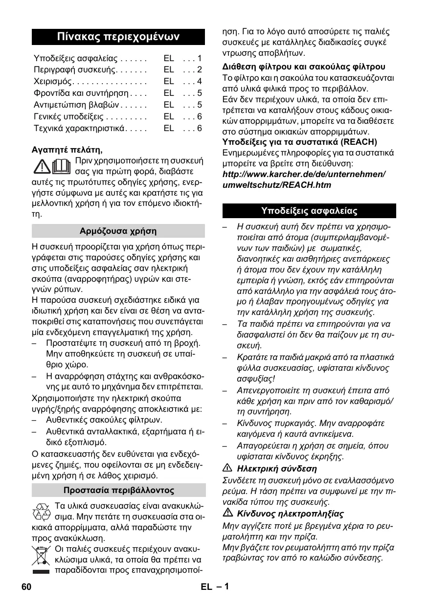 Διάθεση φίλτρου και σακούλας φίλτρου Το φίλτρο και η σακούλα του κατασκευάζονται από υλικά φιλικά προς το περιβάλλον. Εάν δεν περιέχουν υλικά, τα οποία δεν επιτρέπεται να καταλήξουν στους κάδους οικιακών απορριμμάτων, μπορείτε να τα διαθέσετε στο σύστημα οικιακών απορριμμάτων. Υποδείξεις για τα συστατικά (REACH) Ενημερωμένες πληροφορίες για τα συστατικά μπορείτε να βρείτε στη διεύθυνση: http://www.karcher.de/de/unternehmen/ umweltschutz/REACH.htm