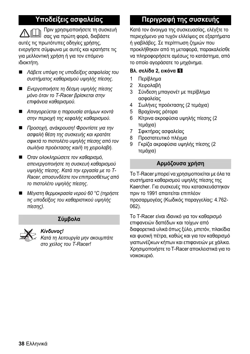 Attention au recul ! Assurer une bonne stabilité et bien tenir le pistolet haute pression avec la rallonge ou la poignée. Mettre le nettoyeur haute pression hors service à la fin du nettoyage. Lors du travail sur le T-Racer, séparer de plus celui-ci du pistolet haute pression. Température d’eau maximale 60 °C (observer les instructions de votre nettoyeur haute pression).