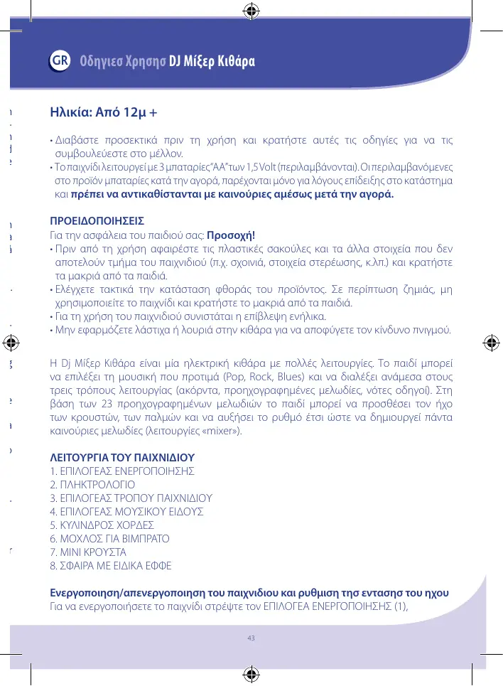 élimination compatible avec l’environnement aide à prévenir d’éventuels effets négatifs sur l’environnement et la santé et favorise le recyclage des matériaux contenus dans les piles. L’élimination abusive du produit par l’utilisateur provoque des dommages à l’environnement et compromet la santé. Pour plus d’informations sur les systèmes de ramassage disponibles, adressez-vous au service local en charge du ramassage des ordures ou au magasin où a été acheté le produit. MISE EN PLACE ET/OU REMPLACEMENT DES PILES • Le remplacement des piles doit toujours être fait par un adulte. • Pour remplacer les piles : desserrer la vis du couvercle sous la guitare à l’aide d’un tournevis, ôter le couvercle et enlever les piles usagées. Introduire les piles neuves en veillant à respecter la polarité (comme indiquée sur le produit), remettre le couvercle en place et revisser à fond. • Ne pas laisser les piles ou des outils éventuels à portée des enfants. • Toujours enlever les piles usagées pour éviter que d’éventuelles fuites de liquide n’endommagent le produit. • Toujours enlever les piles si le jouet n’est pas utilisé pendant une longue période. • Utiliser des piles alcalines identiques ou équivalentes au type de piles recommandé pour le fonctionnement de ce produit. • Ne pas mélanger différents types de piles ou des piles usagées avec des piles neuves. • Ne pas jeter les piles usagées dans le feu et ne pas les jeter dans la nature. Les mettre dans les conteneurs de recyclage prévus à cet effet. • Ne pas provoquer de court-circuit avec les bornes d’alimentation. • Ne pas tenter de recharger les piles non rechargeables : elles pourraient exploser. • L’utilisation de piles rechargeables est déconseillée car elles pourraient réduire le fonctionnement du jouet. • En cas d’utilisation de piles rechargeables, les extraire du jouet avant de les recharger et procéder à la recharge uniquement sous la surveillance d’un adulte. NETTOYAGE ET ENTRETIEN DU JOUET • Nettoyer le jouet avec un chiffon doux et sec pour ne pas endommager le circuit électronique. • Ne pas plonger le jouet dans l’eau. • Protéger avec soin le jouet de la chaleur, de la poussière, du sable et de l’eau. • Le produit ne doit pas être réparé ou modifié par l’acheteur ou par du personnel non qualifié.