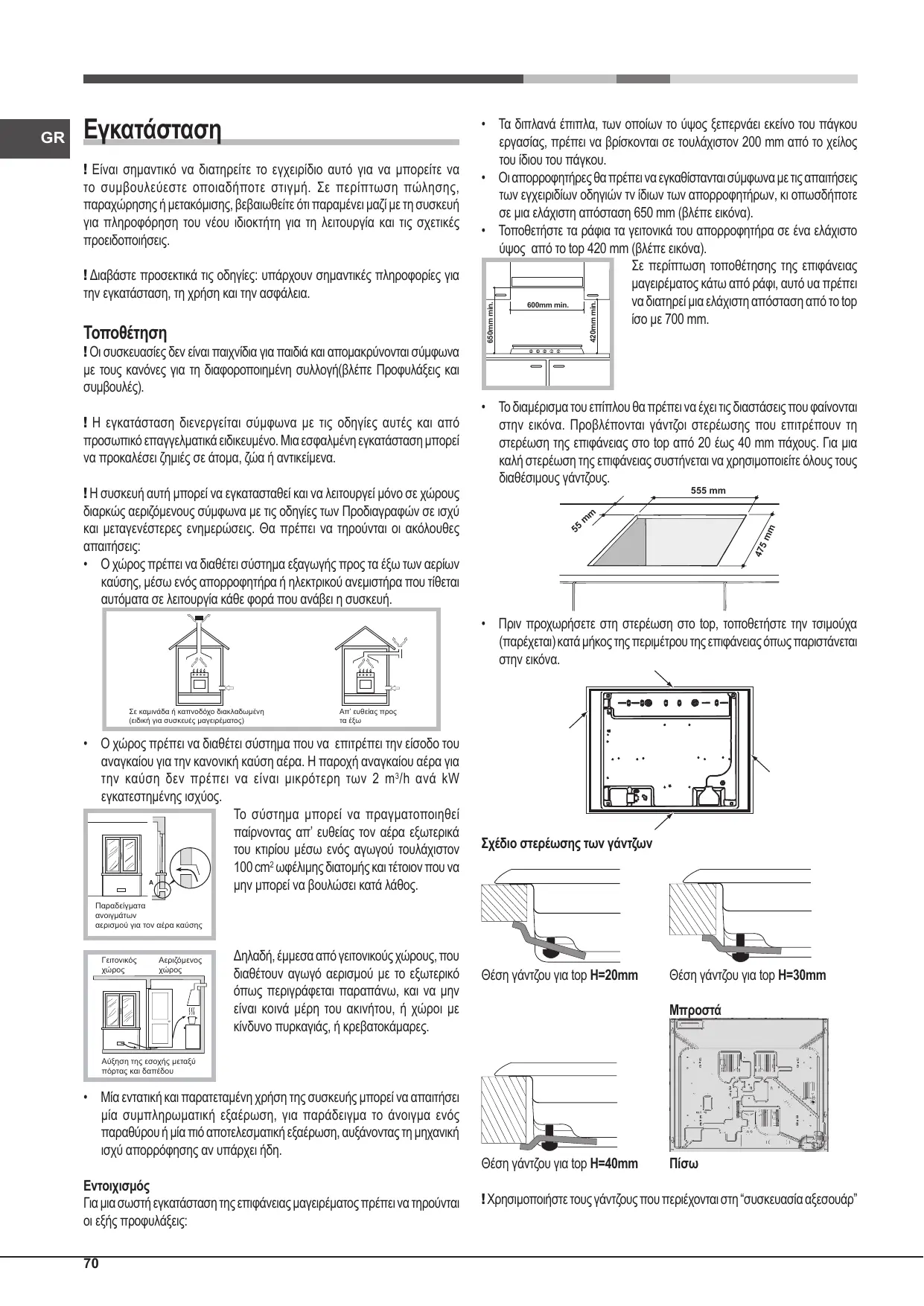- Οι συσκευές αερίου απαιτούν, για τη σωστή λειτουργία, κανονική ανανέωση του αέρα. Βεβαιωθείτε ότι κατά την εγκατάστασή τους πληρούνται οι απαιτήσεις της παραγράφου που σχετίζεται με την “Τοποθέτηση”.