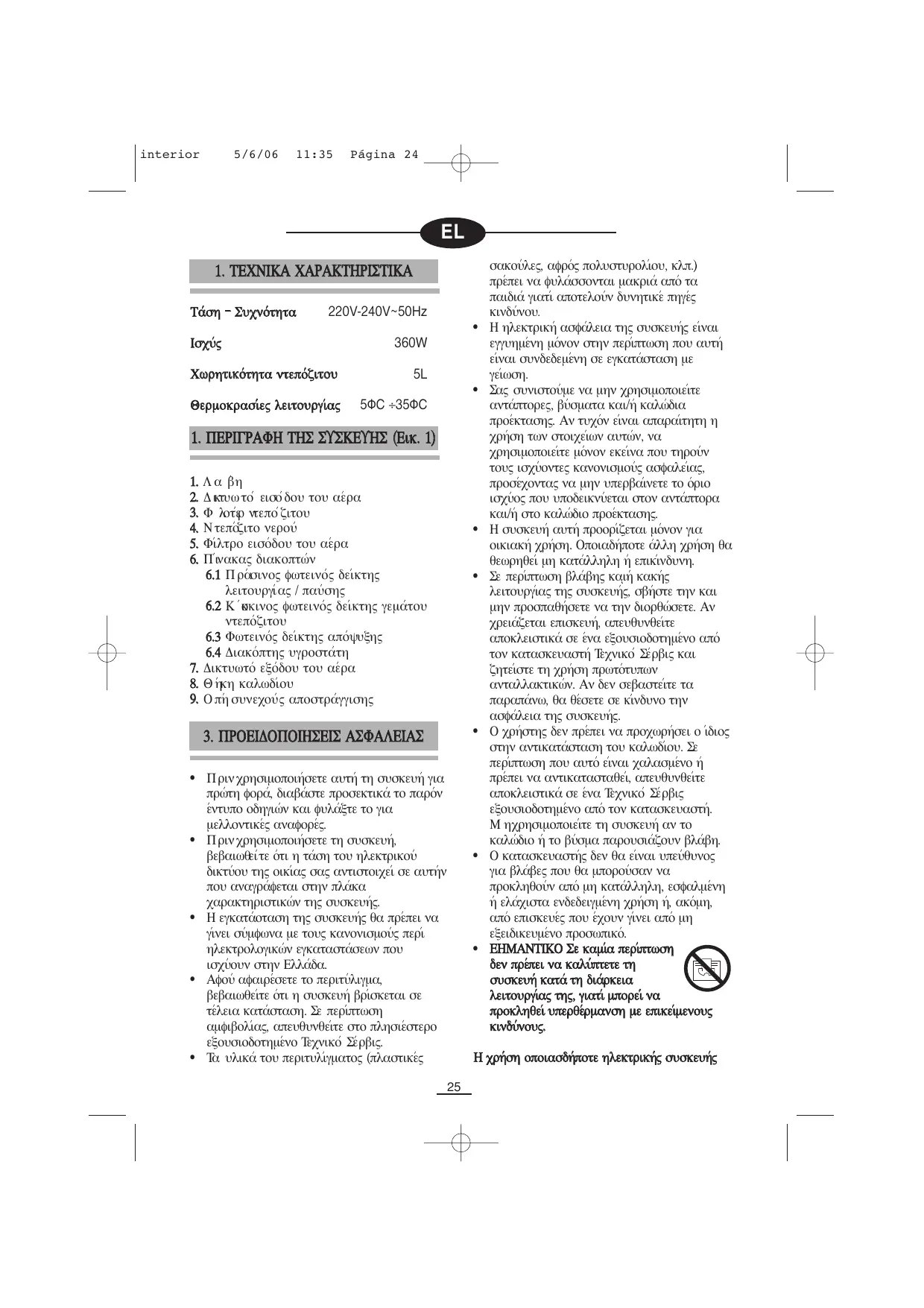 σακουλv ες, αφροςv πολυστυρολιοv υ, κλπ.) πρεπv ει να φυλασ v σονται µακριαv αποv τα παιδιαv γιατιv αποτελουνv δυνητικεv πηγεςv κινδυνv ου. Η ηλεκτρικηv ασφαλv εια της συσκευηςv εινv αι εγγυηµενv η µονv ον στην περιπv τωση που αυτηv εινv αι συνδεδεµενv η σε εγκατασ v ταση µε v ση. Σας συνιστουµv ε να µην χρησιµοποιειτv ε ανταπv τορες, βυσ v µατα και/ηv καλωδ v ια προεκv τασης. Αν τυχονv εινv αι απαραιτv ητη η v η των στοιχειω v ν αυτων v , να χρησιµοποιειτv ε µονv ον εκεινv α που τηρουνv τους ισχυοv ντες κανονισµουςv ασφαλεια v ς, προσεχv οντας να µην υπερβαινv ετε το ορv ιο ισχυοv ς που υποδεικνυεv ται στον ανταπv τορα και/ηv στο καλωδv ιο προεκv τασης. Η συσκευηv αυτηv προοριζv εται µονv ον για οικιακηv χρησ v η. Οποιαδηπ v οτε αλ v λη χρησ v η θα θεωρηθειv µη καταλv ληλη ηv επικινv δυνη. Σε περιπv τωση βλαβv ης καιη / v κακης