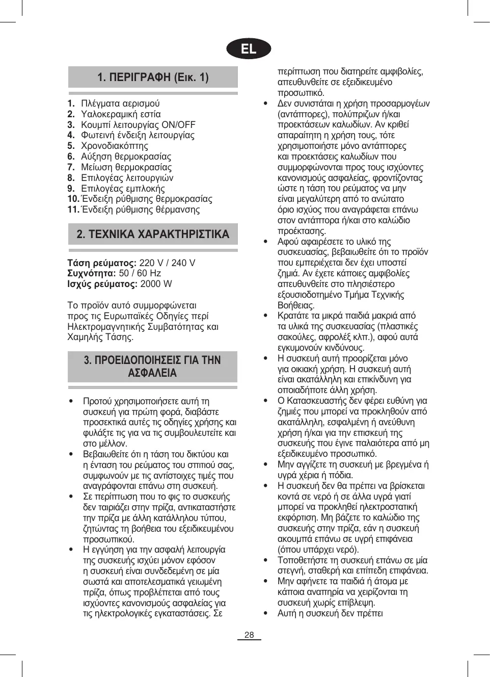 να χρησιμοποιείται από άτομα (συμπεριλαμβανομένων και των παιδιών) που πάσχουν από σωματικές, νευρικές και νοητικές παθήσεις ή που δεν έχουν την εμπειρία και τη γνώση, χωρίς την επίβλεψη ή την καθοδήγηση για τη σωστή χρήση της συσκευής από κάποιο άλλο άτομο υπεύθυνο για την ασφάλειά τους. Μην αφήνετε τα παιδιά να χειρίζονται και να παίζουν με τη συσκευή. Για μεγαλύτερη προστασία, συνιστούμε να εγκαταστήσετε έναν μηχανισμό παραμένοντος ρεύματος για λειτουργικό παραμένον ρεύμα που δεν υπερβαίνει τα 30 mA. Συμβουλευθείτε τον ηλεκτρολόγο σας. Μην απομακρύνεστε από τη συσκευή όταν είναι αναμμένη, γιατί η ίδια η συσκευή μπορεί να γίνει αιτία να διατρέξετε κίνδυνο. Μην τραβάτε ποτέ το καλώδιο, όταν αποσυνδέετε το φις από την πρίζα. Προτού ξεκινήσετε να καθαρίσετε τη συσκευή, βγάλτε το καλώδιο της συσκευής από την πρίζα. Σε περίπτωση βλάβης ή/και κακής λειτουργίας της συσκευής, αλλά και όταν δεν πρόκειται να ξαναχρησιμοποιήσετε τη συσκευή, σβήστε την χωρίς να προσπαθήσετε να την επιδιορθώσετε. Σε περίπτωση που χρειαστεί να επισκευάσετε τη συσκευή, απευθυνθείτε μόνο σε κάποιο εξουσιοδοτημένο, από την Κατασκευάστρια εταιρεία, Τμήμα Τεχνικής Βοήθειας και ζητήστε να τοποθετήσουν τα γνήσια ανταλλακτικά. Σε περίπτωση που το καλώδιο αυτής της συσκευής καταστραφεί, απευθυνθείτε στο εξουσιοδοτήμενο Κέντρο Τεχνικής Βοήθειας για την αντικατάστασή του. Μην αφήνετε την συσκευή εκτεθειμένη σε εξωτερικούς περιβαλλοντικούς παράγοντες (βροχή, ήλιος, πάγος κλπ.). Μην χρησιμοποιείτε και μην τοποθετείτε κανένα μέρος της συσκευής αυτής επάνω ή κοντά σε πηγές θερμότητας (μάτια ηλεκτρικής κουζίνας, κουζίνας γκαζιού ή φούρνους). Μην χρησιμοποιείτε απορρυπαντικά ή διαλυτικά χημικά προϊόντα για τον