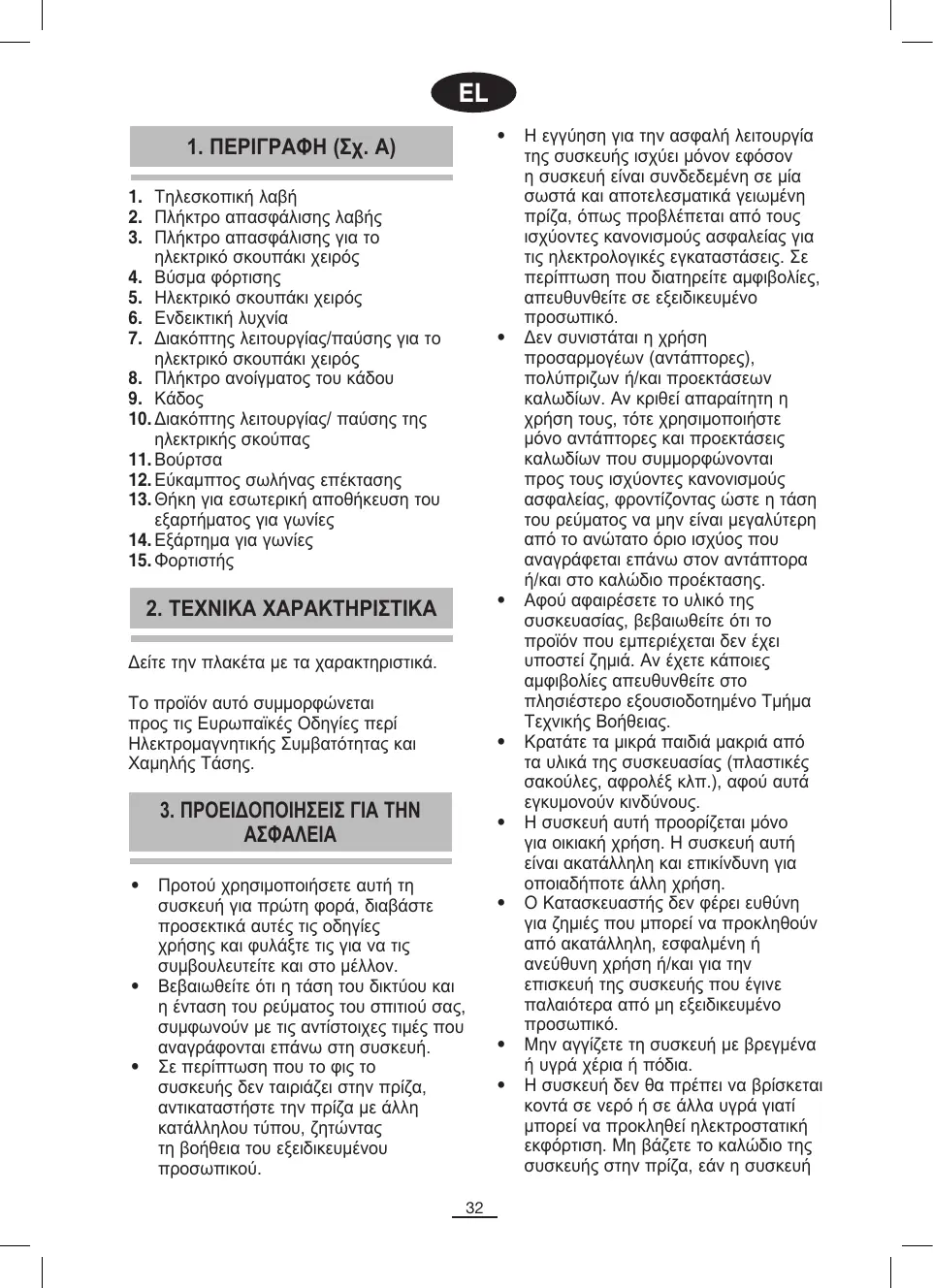H εγγύηση για την ασφαλή λειτουργία της συσκευής ισχύει μόνον εφόσον η συσκευή είναι συνδεδεμένη σε μία σωστά και αποτελεσματικά γειωμένη πρίζα, όπως προβλέπεται από τους ισχύοντες κανονισμούς ασφαλείας για τις ηλεκτρολογικές εγκαταστάσεις. Σε περίπτωση που διατηρείτε αμφιβολίες, απευθυνθείτε σε εξειδικευμένο Δεν συνιστάται η χρήση προσαρμογέων (αντάπτορες), πολύπριζων ή/και προεκτάσεων καλωδίων. Αν κριθεί απαραίτητη η χρήση τους, τότε χρησιμοποιήστε μόνο αντάπτορες και προεκτάσεις καλωδίων που συμμορφώνονται προς τους ισχύοντες κανονισμούς ασφαλείας, φροντίζοντας ώστε η τάση του ρεύματος να μην είναι μεγαλύτερη από το ανώτατο όριο ισχύος που αναγράφεται επάνω στον αντάπτορα ή/και στο καλώδιο προέκτασης. Αφού αφαιρέσετε το υλικό της συσκευασίας, βεβαιωθείτε ότι το προϊόν που εμπεριέχεται δεν έχει υποστεί ζημιά. Αν έχετε κάποιες αμφιβολίες απευθυνθείτε στο πλησιέστερο εξουσιοδοτημένο Τμήμα Τεχνικής Βοήθειας. Κρατάτε τα μικρά παιδιά μακριά από τα υλικά της συσκευασίας (πλαστικές σακούλες, αφρολέξ κλπ.), αφού αυτά εγκυμονούν κινδύνους. Η συσκευή αυτή προορίζεται μόνο για οικιακή χρήση. Η συσκευή αυτή είναι ακατάλληλη και επικίνδυνη για οποιαδήποτε άλλη χρήση. Ο Κατασκευαστής δεν φέρει ευθύνη για ζημιές που μπορεί να προκληθούν από ακατάλληλη, εσφαλμένη ή ανεύθυνη χρήση ή/και για την επισκευή της συσκευής που έγινε παλαιότερα από μη εξειδικευμένο Μην αγγίζετε τη συσκευή με βρεγμένα ή υγρά χέρια ή πόδια. Η συσκευή δεν θα πρέπει να βρίσκεται κοντά σε νερό ή σε άλλα υγρά γιατί μπορεί να προκληθεί ηλεκτροστατική εκφόρτιση. Μη βάζετε το καλώδιο της συσκευής στην πρίζα, εάν η συσκευή