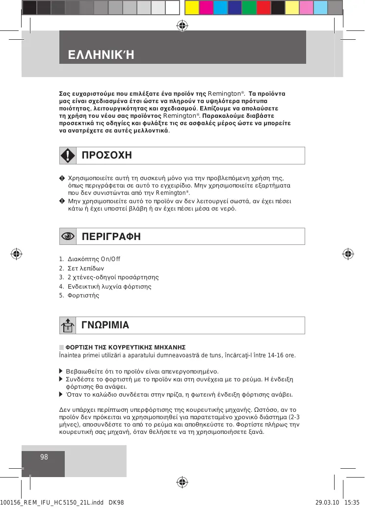 Η συσκευή δεν πρέπει ποτέ να μένει χωρίς επιτήρηση όταν είναι συνδεδεμένη σε ηλεκτρική πρίζα. Το βύσμα και το καλώδιο τροφοδοσίας πρέπει να βρίσκονται μακριά από θερμαινόμενες επιφάνειες. Προσέξτε ώστε να μην βραχούν το βύσμα και το καλώδιο τροφοδοσίας. Μην βγάζετε το προϊόν από την πρίζα με βρεγμένα χέρια. Μη χρησιμοποιείτε το προϊόν αν το καλώδιό του έχει υποστεί βλάβη. Μπορείτε να προμηθευτείτε ανταλλακτικό από το Κέντρο Σέρβις της Remington®. Χρησιμοποιείτε και αποθηκεύετε το προϊόν σε θερμοκρασίες μεταξύ 15°C και 35°C. Πάντα να το βγάζετε από την πρίζα πριν το καθαρίσετε. Χρησιμοποιείτε μόνο τα εξαρτήματα που παρέχονται μαζί με τη συσκευή. Η κουρευτική μηχανή δεν πλένεται. Αν πέσει μέσα σε νερό, βεβαιωθείτε ότι έχει διακοπεί η παροχή ρεύματος στην πρίζα πριν αφαιρέσετε τη μηχανή. Να φυλάσσεται μακριά από παιδιά. Η χρήση αυτής της συσκευής από άτομα με περιορισμένες σωματικές, αισθητήριες ή διανοητικές ικανότητες ή από άτομα χωρίς εμπειρία και γνώση, μπορεί να προκαλέσει κινδύνους. Σε τέτοιες περιπτώσεις πρέπει να έχουν δοθεί σαφείς οδηγίες για τη χρήση της συσκευής ή να υπάρχει επιτήρηση από κάποιον υπεύθυνο για την ασφάλεια των παραπάνω ατόμων. HR/ SRB ΠΡΟΕΙΔΟΠΟΙΗΣΗ – ΓΙΑ ΤΟΝ ΠΕΡΙΟΡΙΣΜΟ ΤΟΥ ΚΙΝΔΥΝΟΥ ΕΓΚΑΥΜΑΤΩΝ, ΗΛΕΚΤΡΟΠΛΗΞΙΑΣ, ΠΥΡΚΑΓΙΑΣ Ή ΤΡΑΥΜΑΤΙΣΜΟΥ: