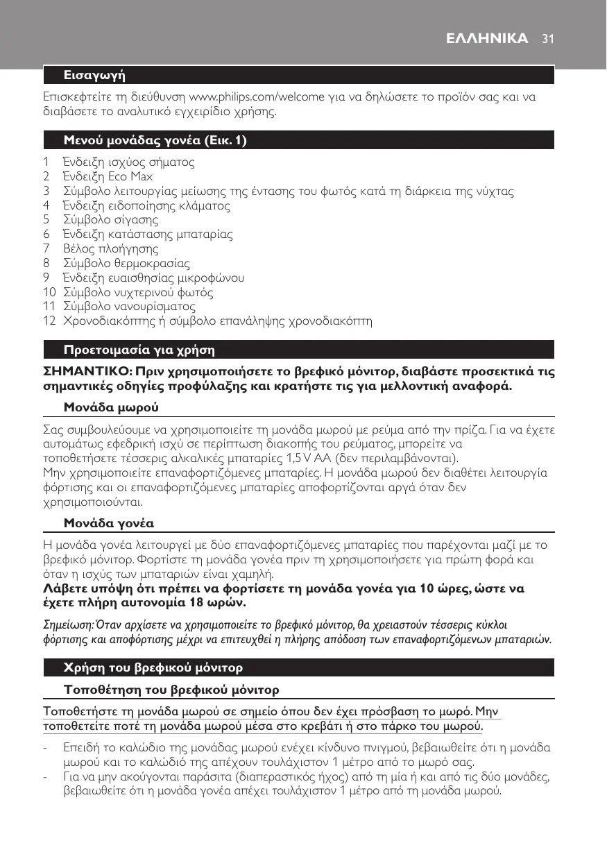Ένδειξη ισχύος σήματος Ένδειξη Eco Max Σύμβολο λειτουργίας μείωσης της έντασης του φωτός κατά τη διάρκεια της νύχτας Ένδειξη ειδοποίησης κλάματος Σύμβολο σίγασης Ένδειξη κατάστασης μπαταρίας Βέλος πλοήγησης Σύμβολο θερμοκρασίας Ένδειξη ευαισθησίας μικροφώνου Σύμβολο νυχτερινού φωτός Σύμβολο νανουρίσματος Χρονοδιακόπτης ή σύμβολο επανάληψης χρονοδιακόπτη Προετοιμασία για χρήση ΣΗΜΑΝΤΙΚΟ: Πριν χρησιμοποιήσετε το βρεφικό μόνιτορ, διαβάστε προσεκτικά τις σημαντικές οδηγίες προφύλαξης και κρατήστε τις για μελλοντική αναφορά. Μονάδα μωρού Σας συμβουλεύουμε να χρησιμοποιείτε τη μονάδα μωρού με ρεύμα από την πρίζα. Για να έχετε αυτομάτως εφεδρική ισχύ σε περίπτωση διακοπής του ρεύματος, μπορείτε να τοποθετήσετε τέσσερις αλκαλικές μπαταρίες 1,5 V AA (δεν περιλαμβάνονται). Μην χρησιμοποιείτε επαναφορτιζόμενες μπαταρίες. Η μονάδα μωρού δεν διαθέτει λειτουργία φόρτισης και οι επαναφορτιζόμενες μπαταρίες αποφορτίζονται αργά όταν δεν χρησιμοποιούνται. Μονάδα γονέα Η μονάδα γονέα λειτουργεί με δύο επαναφορτιζόμενες μπαταρίες που παρέχονται μαζί με το βρεφικό μόνιτορ. Φορτίστε τη μονάδα γονέα πριν τη χρησιμοποιήσετε για πρώτη φορά και όταν η ισχύς των μπαταριών είναι χαμηλή. Λάβετε υπόψη ότι πρέπει να φορτίσετε τη μονάδα γονέα για 10 ώρες, ώστε να έχετε πλήρη αυτονομία 18 ωρών. Σημείωση: Όταν αρχίσετε να χρησιμοποιείτε το βρεφικό μόνιτορ, θα χρειαστούν τέσσερις κύκλοι φόρτισης και αποφόρτισης μέχρι να επιτευχθεί η πλήρης απόδοση των επαναφορτιζόμενων μπαταριών. Χρήση του βρεφικού μόνιτορ Τοποθέτηση του βρεφικού μόνιτορ Τοποθετήστε τη μονάδα μωρού σε σημείο όπου δεν έχει πρόσβαση το μωρό. Μην τοποθετείτε ποτέ τη μονάδα μωρού μέσα στο κρεβάτι ή στο πάρκο του μωρού. -- Επειδή το καλώδιο της μονάδας μωρού ενέχει κίνδυνο πνιγμού, βεβαιωθείτε ότι η μονάδα μωρού και το καλώδιό της απέχουν τουλάχιστον 1 μέτρο από το μωρό σας. -- Για να μην ακούγονται παράσιτα (διαπεραστικός ήχος) από τη μία ή και από τις δύο μονάδες, βεβαιωθείτε ότι η μονάδα γονέα απέχει τουλάχιστον 1 μέτρο από τη μονάδα μωρού.