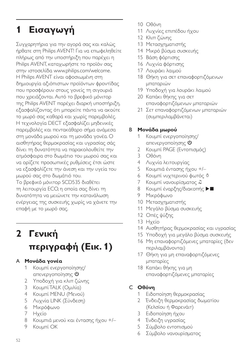 Λυχνίες επιπέδου ήχου Μετασχηματιστής Μικρό βύσμα συσκευής Βάση φόρτισης Λυχνία φόρτισης Λουράκι λαιμού Θήκη για σετ επαναφορτιζόμενων 19 Υποδοχή για λουράκι λαιμού 20 Καπάκι θήκης για σετ επαναφορτιζόμενων μπαταριών 21 Σετ επαναφορτιζόμενων μπαταριών (συμπεριλαμβάνεται) 1 Εισαγωγή Συγχαρητήρια για την αγορά σας και καλώς ήρθατε στη Philips AVENT! Για να επωφεληθείτε πλήρως από την υποστήριξη που παρέχει η Philips AVENT, καταχωρήστε το προϊόν σας στην ιστοσελίδα www.philips.com/welcome. Η Philips AVENT είναι αφοσιωμένη στη δημιουργία αξιόπιστων προϊόντων φροντίδας που προσφέρουν στους γονείς τη σιγουριά που χρειάζονται. Αυτό το βρεφικό μόνιτορ της Philips AVENT παρέχει διαρκή υποστήριξη, εξασφαλίζοντας ότι μπορείτε πάντα να ακούτε το μωρό σας καθαρά και χωρίς παρεμβολές. Η τεχνολογία DECT εξασφαλίζει μηδενικές παρεμβολές και πεντακάθαρο σήμα ανάμεσα στη μονάδα μωρού και τη μονάδα γονέα. Ο αισθητήρας θερμοκρασίας και υγρασίας σάς δίνει τη δυνατότητα να παρακολουθείτε την ατμόσφαιρα στο δωμάτιο του μωρού σας και να ορίζετε προσωπικές ρυθμίσεις έτσι ώστε να εξασφαλίζετε την άνεση και την υγεία του μωρού σας στο δωμάτιό του. Το βρεφικό μόνιτορ SCD535 διαθέτει τη λειτουργία ECO, η οποία σας δίνει τη δυνατότητα να μειώνετε την κατανάλωση ενέργειας της συσκευής χωρίς να χάνετε την επαφή με το μωρό σας. 2 Γενική περιγραφή (Εικ. 1) A Μονάδα γονέα 1 Κουμπί ενεργοποίησης/ απενεργοποίησης 3 2 Υποδοχή για κλιπ ζώνης 3 Κουμπί TALK (Ομιλία) 4 Κουμπί MENU (Μενού) 5 Λυχνία LINK (Σύνδεση) 6 Μικρόφωνο 7 Ηχείο 8 Κουμπιά μενού και έντασης ήχου +/– 9 Κουμπί OK