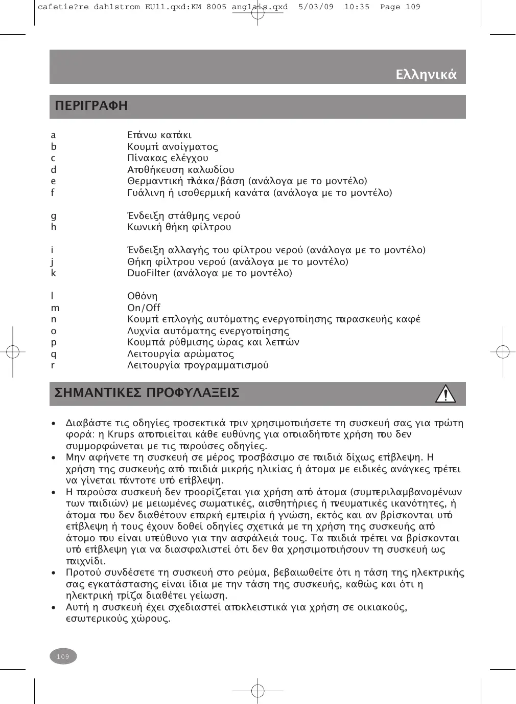 Διαβάστε τις οδηγίες =ροσεκτικά =ριν χρησιµο=οιήσετε τη συσκευή σας για =ρώτη φορά: η Krups α=ο=οιείται κάθε ευθύνης για ο=οιαδή=οτε χρήση =ου δεν συµµορφώνεται µε τις =αρούσες οδηγίες. Μην αφήνετε τη συσκευή σε µέρος =ροσβάσιµο σε =αιδιά δίχως ε=ίβλεψη. Η χρήση της συσκευής α=ό =αιδιά µικρής ηλικίας ή άτοµα µε ειδικές ανάγκες =ρέ=ει να γίνεται =άντοτε υ=ό ε=ίβλεψη. Η =αρούσα συσκευή δεν =ροορίζεται για χρήση α=ό άτοµα (συµ=εριλαµβανοµένων των =αιδιών) µε µειωµένες σωµατικές, αισθητήριες ή =νευµατικές ικανότητες, ή άτοµα =ου δεν διαθέτουν ε=αρκή εµ=ειρία ή γνώση, εκτός και αν βρίσκονται υ=ό ε=ίβλεψη ή τους έχουν δοθεί οδηγίες σχετικά µε τη χρήση της συσκευής α=ό άτοµο =ου είναι υ=εύθυνο για την ασφάλειά τους. Τα =αιδιά =ρέ=ει να βρίσκονται υ=ό ε=ίβλεψη για να διασφαλιστεί ότι δεν θα χρησιµο=οιήσουν τη συσκευή ως Προτού συνδέσετε τη συσκευή στο ρεύµα, βεβαιωθείτε ότι η τάση της ηλεκτρικής σας εγκατάστασης είναι ίδια µε την τάση της συσκευής, καθώς και ότι η ηλεκτρική =ρίζα διαθέτει γείωση. Αυτή η συσκευή έχει σχεδιαστεί α=οκλειστικά για χρήση σε οικιακούς, εσωτερικούς χώρους.