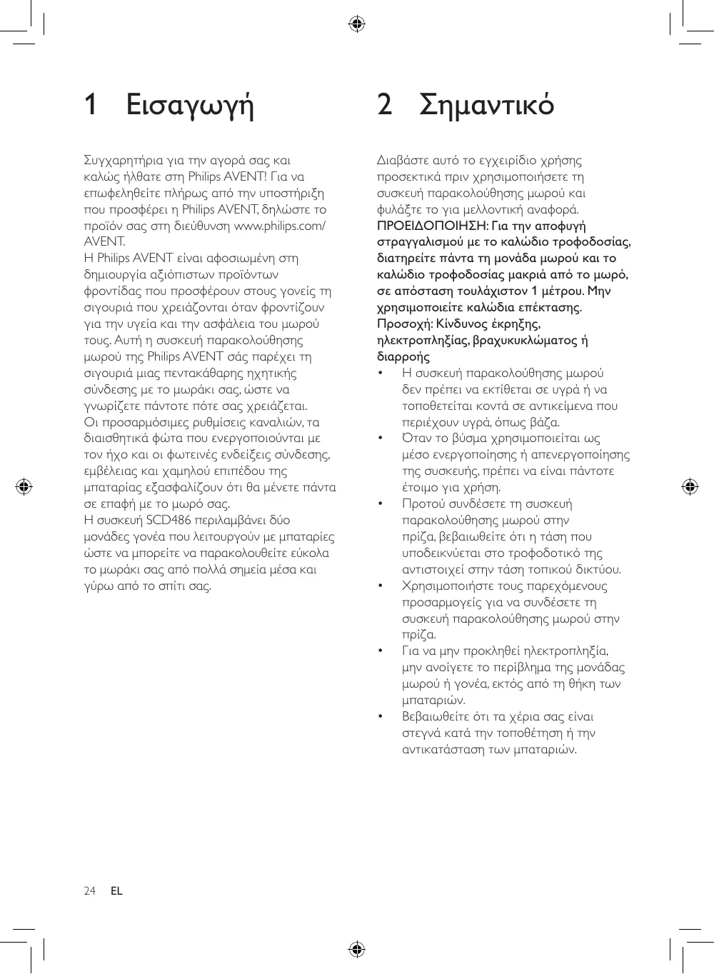 D euts ch Wenn Sie die Lösung, die Sie benötigen, nicht in diesem Abschnitt finden, holen Sie sich Unterstützung unter www.philips.com/AVENT, oder wenden Sie sich an das Philips Service-Center in Ihrem Land. 1 Εισαγωγή 2 Σημαντικό Συγχαρητήρια για την αγορά σας και καλώς ήλθατε στη Philips AVENT! Για να επωφεληθείτε πλήρως από την υποστήριξη που προσφέρει η Philips AVENT, δηλώστε το προϊόν σας στη διεύθυνση www.philips.com/ AVENT. Η Philips AVENT είναι αφοσιωμένη στη δημιουργία αξιόπιστων προϊόντων φροντίδας που προσφέρουν στους γονείς τη σιγουριά που χρειάζονται όταν φροντίζουν για την υγεία και την ασφάλεια του μωρού τους. Αυτή η συσκευή παρακολούθησης μωρού της Philips AVENT σάς παρέχει τη σιγουριά μιας πεντακάθαρης ηχητικής σύνδεσης με το μωράκι σας, ώστε να γνωρίζετε πάντοτε πότε σας χρειάζεται. Οι προσαρμόσιμες ρυθμίσεις καναλιών, τα διαισθητικά φώτα που ενεργοποιούνται με τον ήχο και οι φωτεινές ενδείξεις σύνδεσης, εμβέλειας και χαμηλού επιπέδου της μπαταρίας εξασφαλίζουν ότι θα μένετε πάντα σε επαφή με το μωρό σας. Η συσκευή SCD486 περιλαμβάνει δύο μονάδες γονέα που λειτουργούν με μπαταρίες ώστε να μπορείτε να παρακολουθείτε εύκολα το μωράκι σας από πολλά σημεία μέσα και γύρω από το σπίτι σας. Διαβάστε αυτό το εγχειρίδιο χρήσης προσεκτικά πριν χρησιμοποιήσετε τη συσκευή παρακολούθησης μωρού και φυλάξτε το για μελλοντική αναφορά. ΠΡΟΕΙΔΟΠΟΙΗΣΗ: Για την αποφυγή στραγγαλισμού με το καλώδιο τροφοδοσίας, διατηρείτε πάντα τη μονάδα μωρού και το καλώδιο τροφοδοσίας μακριά από το μωρό, σε απόσταση τουλάχιστον 1 μέτρου. Μην χρησιμοποιείτε καλώδια επέκτασης. Προσοχή: Κίνδυνος έκρηξης, ηλεκτροπληξίας, βραχυκυκλώματος ή