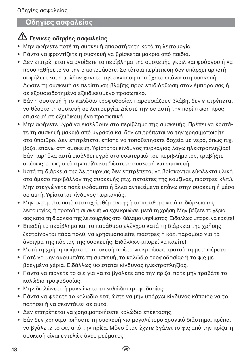 - ∆εν επιτρέπεται να ανοίξετε το περίβληµα της συσκευής γκριλ και φούρνου ή να προσπαθήσετε να την επισκευάσετε. Σε τέτοια περίπτωση δεν υπάρχει αρκετή ασφάλεια και επιπλέον χάνετε την εγγύηση που έχετε επάνω στη συσκευή. ∆ώστε τη συσκευή σε περίπτωση βλάβης προς επιδιρθωση στον έµπορο σας ή σε εξουσιοδοτηµένο εξειδικευµένο προσωπικ.