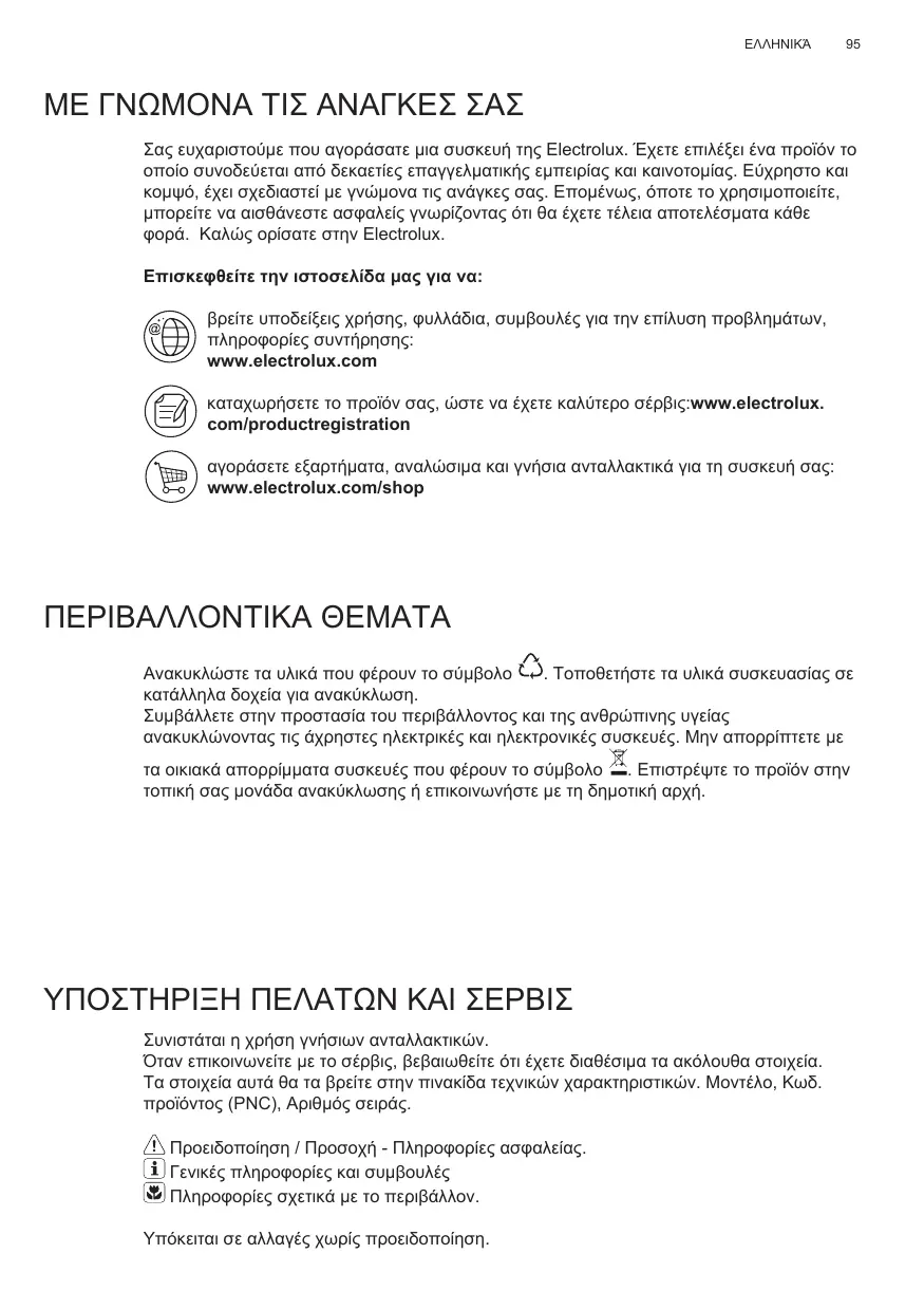 ΜΕ ΓΝΩΜΟΝΑ ΤΙΣ ΑΝΑΓΚΕΣ ΣΑΣ Σας ευχαριστούμε που αγοράσατε μια συσκευή της Electrolux. Έχετε επιλέξει ένα προϊόν το οποίο συνοδεύεται από δεκαετίες επαγγελματικής εμπειρίας και καινοτομίας. Εύχρηστο και κομψό, έχει σχεδιαστεί με γνώμονα τις ανάγκες σας. Επομένως, όποτε το χρησιμοποιείτε, μπορείτε να αισθάνεστε ασφαλείς γνωρίζοντας ότι θα έχετε τέλεια αποτελέσματα κάθε φορά. Καλώς ορίσατε στην Electrolux. Επισκεφθείτε την ιστοσελίδα μας για να: βρείτε υποδείξεις χρήσης, φυλλάδια, συμβουλές για την επίλυση προβλημάτων, πληροφορίες συντήρησης: www.electrolux.com καταχωρήσετε το προϊόν σας, ώστε να έχετε καλύτερο σέρβις:www.electrolux. com/productregistration αγοράσετε εξαρτήματα, αναλώσιμα και γνήσια ανταλλακτικά για τη συσκευή σας: www.electrolux.com/shop ΠΕΡΙΒΑΛΛΟΝΤΙΚΑ ΘΕΜΑΤΑ Ανακυκλώστε τα υλικά που φέρουν το σύμβολο . Τοποθετήστε τα υλικά συσκευασίας σε κατάλληλα δοχεία για ανακύκλωση. Συμβάλλετε στην προστασία του περιβάλλοντος και της ανθρώπινης υγείας ανακυκλώνοντας τις άχρηστες ηλεκτρικές και ηλεκτρονικές συσκευές. Μην απορρίπτετε με τα οικιακά απορρίμματα συσκευές που φέρουν το σύμβολο . Επιστρέψτε το προϊόν στην τοπική σας μονάδα ανακύκλωσης ή επικοινωνήστε με τη δημοτική αρχή. ΥΠΟΣΤΗΡΙΞΗ ΠΕΛΑΤΩΝ ΚΑΙ ΣΕΡΒΙΣ Συνιστάται η χρήση γνήσιων ανταλλακτικών. Όταν επικοινωνείτε με το σέρβις, βεβαιωθείτε ότι έχετε διαθέσιμα τα ακόλουθα στοιχεία. Τα στοιχεία αυτά θα τα βρείτε στην πινακίδα τεχνικών χαρακτηριστικών. Μοντέλο, Κωδ. προϊόντος (PNC), Αριθμός σειράς. Προειδοποίηση / Προσοχή - Πληροφορίες ασφαλείας. Γενικές πληροφορίες και συμβουλές Πληροφορίες σχετικά με το περιβάλλον. Υπόκειται σε αλλαγές χωρίς προειδοποίηση.