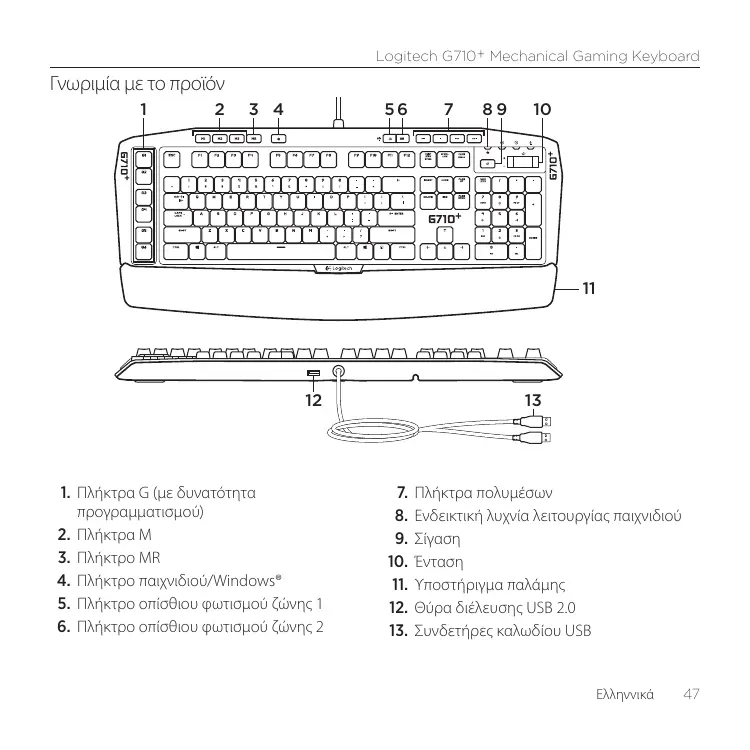 Χαρακτηριστικά προϊόντος • Έξι προγραμματιζόμενα πλήκτρα G και τρία πλήκτρα M παρέχουν έως και 18 μοναδικές λειτουργίες ανά παιχνίδι. • Προσαρμόστε τα πλήκτρα G χρησιμοποιώντας το λογισμικό Logitech Gaming Software. Για να καταχωρίσετε μια μακροεντολή: 1. Πατήστε το πλήκτρο MR. 2. Πατήστε ένα πλήκτρο G. 3. Πληκτρολογήστε τα πλήκτρα που θα καταχωρηθούν. 4. Πατήστε το πλήκτρο MR. Για να καταχωρίσετε μια δεύτερη μακροεντολή στο ίδιο πλήκτρο G, πατήστε M2 και επαναλάβετε τα βήματα 1–4. Για μια τρίτη μακροεντολή, πατήστε M3 και επαναλάβετε τα βήματα 1–4. Κάντε λήψη και εγκαταστήστε το λογισμικό Logitech Gaming Software από τη διεύθυνση www.logitech.com/support/g710.