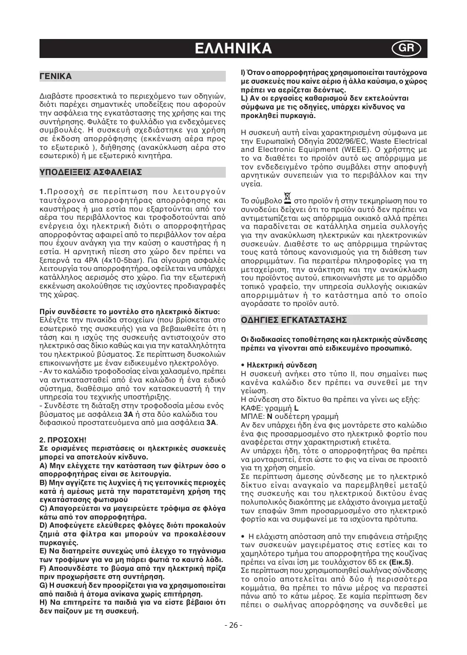 - Si el cable de alimentación está dañado, se debe cambiar con un cable o conjunto especial de cables que puede suministrar tanto el fabricante como el servicio de asistencia técnica. - Conecte el dispositivo a la red de alimentación a través de un enchufe con fusible 3A o a los dos cables de la línea bifásica protegidos por un fusible 3A. 2. ¡Atención! En determinadas circunstancias los electrodomésticos pueden ser peligrosos. A) No intente controlar los filtros cuando la campana está en funcionamiento B) Durante el uso prolongado de la instalación de iluminación o inmediatamente después, no toque las lámparas ni las zonas adyacentes a ellas. C) Está prohibido cocinar a fuego directo debajo de la campana D) Evite dejar la llama libre porque puede dañar los filtros y constituye un riesgo de incendio E) Controle constantemente los alimentos fritos para evitar que el aceite sobrecalentado se prenda fuego F) Antes de efectuar cualquier operación de mantenimiento, desconecte la campana de la red eléctrica. G) Este aparato no debe ser utilizado por niños o personas que necesiten de supervisión. H) Controle que los niños no jueguen con el aparato. I) Cuando la campana se utiliza simultáneamente con aparatos que queman gas u otros combustibles, el ambiente debe estar adecuadamente ventilado. L) Si las operaciones de limpieza no se realizan respetando las instrucciones, hay peligro de incendio. Este aparato está fabricado en conformidad con la Norma Europea 2002/96/EC, Waste Electrical and Electronic Equipment (WEEE). Controlando que este producto sea eliminado de modo correcto, el usuario contribuye a prevenir