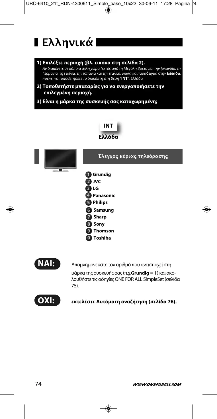 Απομνημονεύστε τον αριθμό που αντιστοιχεί στη μάρκα της συσκευής σας (π.χ.Grundig = 1) και ακολουθήστε τις οδηγίες ONE FOR ALL SimpleSet (σελίδα 75).