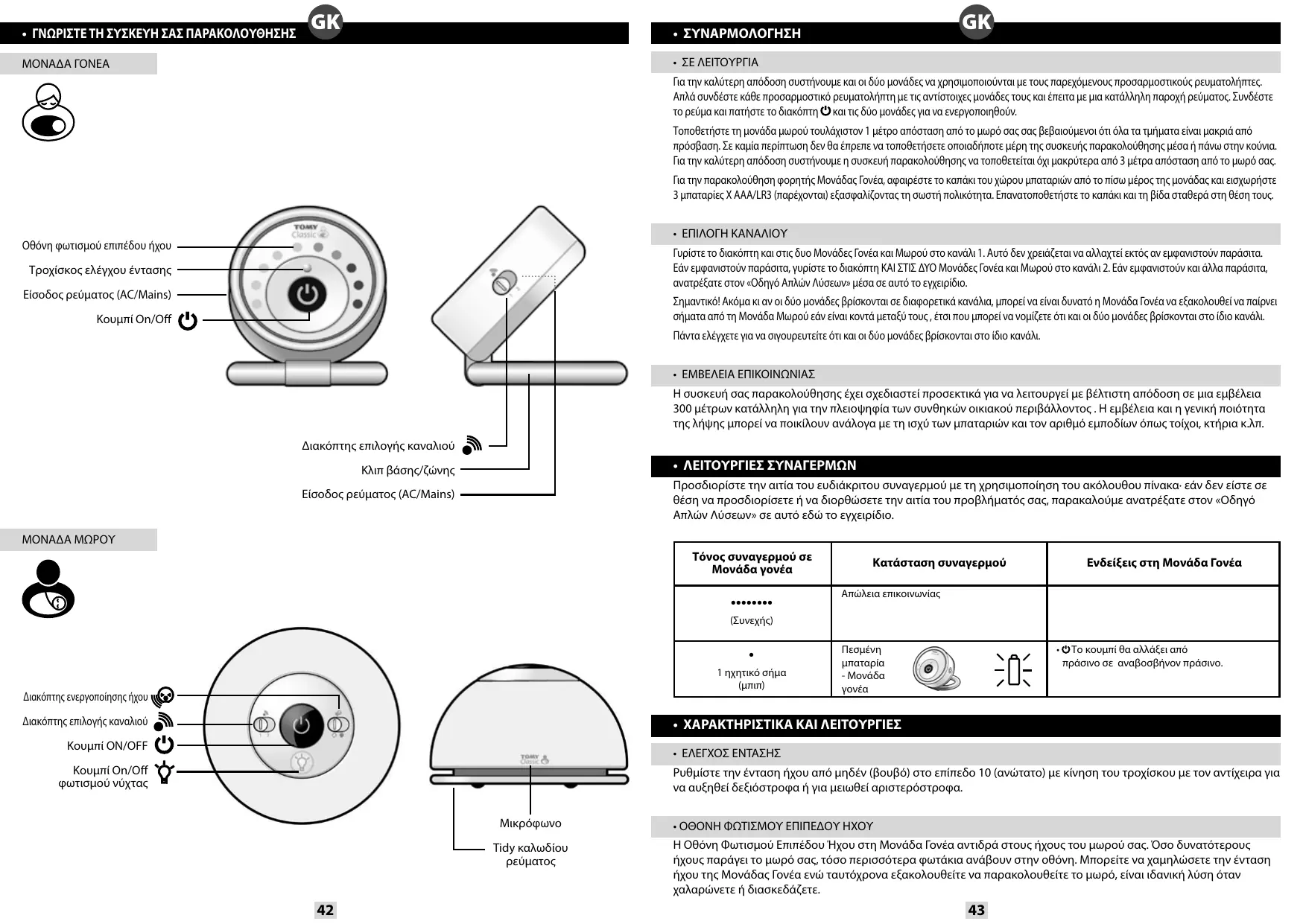 - ΣΥΧΝΕΣ ΕΡΩΤΗΣΕΙΣ ΕΡ. Γιατί εξακολουθώ να έχω παράσιτα στη συσκευή μου ακόμα και αφού εγώ έχω αλλάξει κανάλι; Α. Αυτό θα μπορούσε να οφείλεται στο τοπικό σας περιβάλλον. Υπερυψωμένα καλώδια ρεύματος, τοπικές συσκευές αποστολής ραδιοσημάτων, υψηλά κτήρια, παρόμοιος εξοπλισμός παρακολούθησης/ραδιοφωνικές συσκευές που λειτουργούν στην περιοχή σας μπορεί να δημιουργήσουν τις παράσιτα. ΕΡ. Η συσκευή μου παρακολούθηση δεν έχει επαρκή εμβέλεια; Α. Η συσκευή αυτή είναι σχεδιασμένη ώστε να έχει μια εμβέλεια περίπου 300 μέτρων σε βέλτιστες (ανοικτού πεδίου) συνθήκες. Εμπόδια του περιβάλλοντος χώρου όπως υπερυψωμένα καλώδια ρεύματος, οι τοπικές ραδιοφωνικές συσκευές αποστολής σημάτων, υψηλά κτήρια κ.λπ. μπορεί να μειώσουν την εμβέλεια. Για την καλύτερη δυνατή απόδοση συστήνουμε να χρησιμοποιείτε τη συσκευή σας με τους παρεχόμενους προσαρμοστικούς ρευματολήπτες. Ερ. Μπορώ να χρησιμοποιήσω τη συσκευή μου παρακολούθησης στο εξωτερικό; Α. Μπορείτε να χρησιμοποιήσετε τη συσκευή παρακολούθησης σας στη χώρα που αγοράστηκε και οπουδήποτε στην ΕΕ. Αν και η συσκευή σας παρακολούθησης μπορεί να λειτουργήσει σωστά σε άλλες χώρες, η λειτουργική της συχνότητά μπορεί να επηρεάσει (ή να επηρεαστεί από) άλλες συσκευές και θα μπορούσε να μην είναι νόμιμη. Η Tomy δεν μπορεί να αποδεχτεί οποιαδήποτε ευθύνη για τη χρήση εκτός της χώρας στην οποία αγοράσατε τη συσκευή παρακολούθησης σας ή εκτός της ΕΕ.
